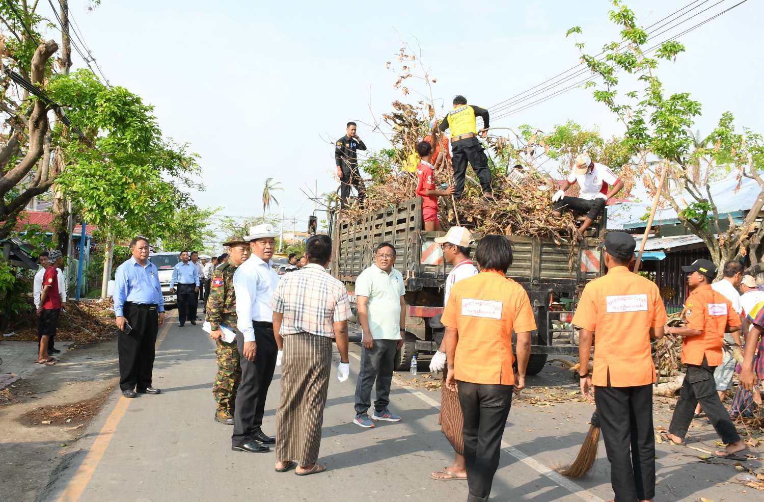 ဦးစွာ ဗိုလ်ချုပ်ကြီးတင်အောင် စန်းနှင့်အဖွဲ့သည် စစ်တွေမြို့ ကျောင်းကြီးလမ်း ရပ်ကွက်ကျောင်းကြီးလမ်းနှင့် မင်းဘာကြီး လမ်းဘေးဝဲယာ တစ်လျှောက်ရှိ အမှိုက်များနှင့် သစ်ပင်၊ သစ်ကိုင်း များအား မြန်မာနိုင်ငံရဲတပ်ဖွဲ့၊ မီးသတ်တပ်ဖွဲ့၊ ဌာနဆိုင်ရာ ဝန်ထမ်းများ၊ လူမှုကူညီရေး အသင်းအဖွဲ့များနှင့် ရပ်ကွက်နေ ပြည်သူ စုစုပေါင်းအင်အား ၆၀၀ ကျော်ဖြင့် ခုတ်ထွင်ရှင်းလင်း ဖယ်ရှားနေမှုကို သွားရောက် ကြည့်ရှုအားပေးပြီး မြို့ရွာသန့်ရှင်း သာယာရေး ဝိုင်းဝန်းပူးပေါင်း ဆောင်ရွက်သွားကြရန်၊ မကြာမီ မိုးရာသီရောက်ရှိတော့မည်ဖြစ်သဖြင့် ရေစီးရေလာကောင်း မွန်စေ ရေးအတွက် ရေမြောင်းများကိုပါ တစ်ပါတည်း ရှင်းလင်းကြရန် တာဝန်ရှိသူများကို မှာကြားသည်။