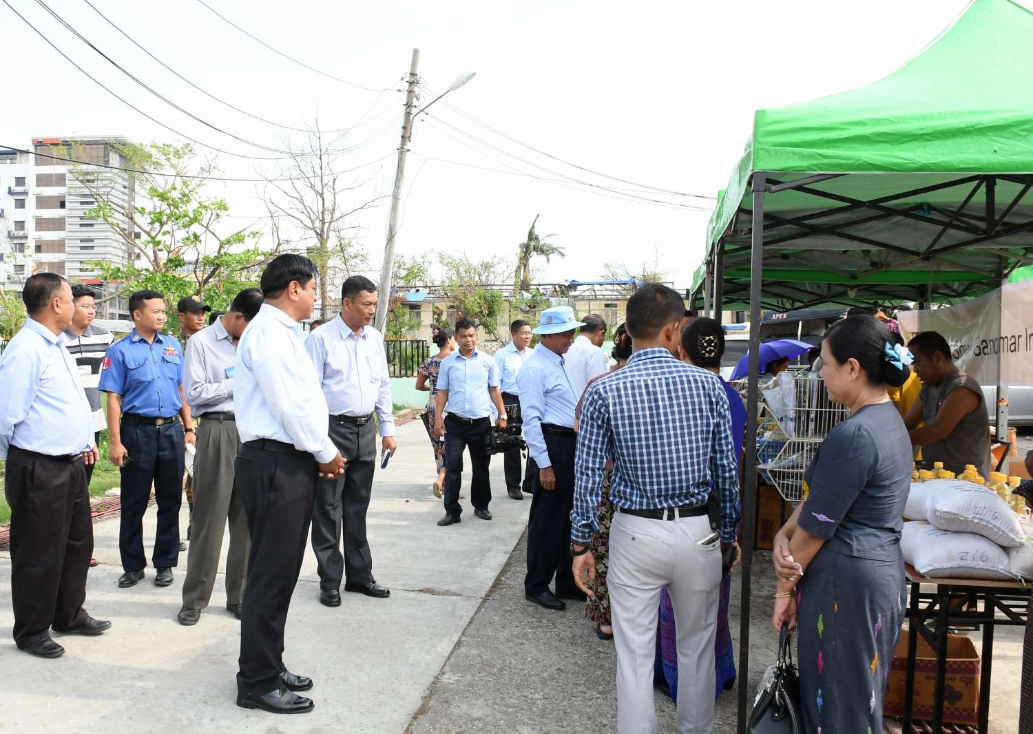 မွန်းလွဲပိုင်းတွင် ဗိုလ်ချုပ်ကြီး တင်အောင်စန်းနှင့် အဖွဲ့သည် မုန်တိုင်းဒဏ်သင့် ပြည်သူများ နှင့် ဌာနဆိုင်ရာဝန်ထမ်းများ စားသောက်ရေး အဆင်ပြေစေရန်နှင့် ဈေးနှုန်းသက်သာစွာ ဝယ်ယူနိုင်ရန် စစ်တွေမြို့ ဦးဥတ္တမပန်းခြံ အတွင်း၌ အနောက်ပိုင်းတိုင်း စစ်ဌာနချုပ် စစ်တွေတပ်နယ် အရောင်းဆိုင်၊ မြန်မာ့စီးပွားရေးကော်ပိုရေးရှင်း ရိုးမစတား အရောင်းဆိုင်၊ မြန်မာ့စီးပွားရေး ဦးပိုင်အများနှင့် သက်ဆိုင်သော ကုမ္ပဏီလီမိတက် ဂန္ဓမာအရောင်း ဆိုင်တို့မှ လျှပ်စစ်ပစ္စည်းများ၊ အိမ်ဆောက်ပစ္စည်းများ၊ လူသုံးကုန်ပစ္စည်းများ၊ အခြေခံစားသောက် ကုန်ပစ္စည်းများ၊ အသား၊ ငါး၊ ဟင်းသီးဟင်းရွက်နှင့် မီးဖိုချောင် သုံးပစ္စည်းများ ရောင်းချပေးနေမှု နှင့် ဒေသခံပြည်သူများ တစ်ခဲနက် ဝယ်ယူအားပေးနေမှုကို ကြည့်ရှု အားပေးသည်။