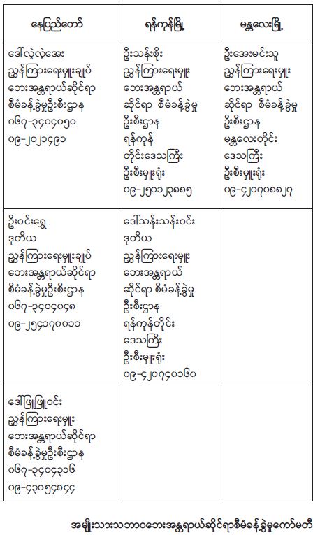၆။ လှူဒါန်းလိုသူများအနေဖြင့် အောက်ပါပုဂ္ဂိုလ်များသို့ ဆက်သွယ် မေးမြန်းလှူဒါန်းနိုင်ပါသည်-