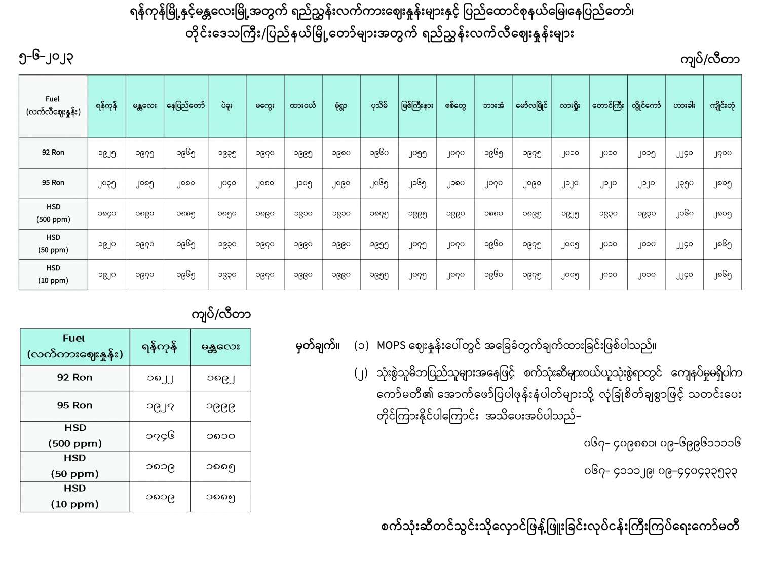 ရန်ကုန်မြို့နှင့် မန္တလေးမြို့အတွက် ရည်ညွှန်းလက်ကားဈေးနှုန်းများနှင့် ပြည်ထောင်စုနယ်မြေ နေပြည်တော်၊ တိုင်းဒေသကြီး/ပြည်နယ် မြို့တော်များအတွက် ရည်ညွှန်းလက်လီဈေးနှုန်းများ 06/05/2023