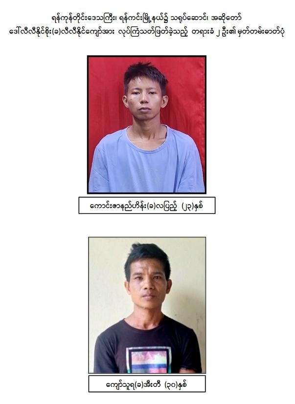 သို့ဖြစ်၍ လုံခြုံရေးတပ်ဖွဲ့ဝင်များမှ ဒေါ်လီလီနိုင်စိုး(ခ)လီလီနိုင်ကျော် အားလုပ်ကြံသတ်ဖြတ်ခဲ့သည့် တရားခံအားဖမ်းဆီးရမိရေးအတွက် ဖြစ်စဉ်ဖြစ်ပွားရာနေရာဝန်းကျင်တွင် စောင့်ကြည့်စစ်ဆေးမှုများပြုလုပ်၍ အကြမ်းဖက်သမားများအား ရှာဖွေဖော်ထုတ်ဖမ်းဆီးခြင်းများကို နေ့/ညမပြတ် အရှိန်အဟုန်မြှင့် ကြိုးပမ်းဆောင်ရွက်ခဲ့ရာ တရားမျှတမှုကိုလိုလားပြီး အကြမ်းဖက်မှုကိုမလိုလားသည့် ပြည်သူများ၏မျက်မြင်သတင်းပေးပို့ချက်များနှင့် မြေပြင်သတင်းစုံစမ်းရရှိချက်များအရ ဇွန်လ ၄ ရက် နံနက်ပိုင်းတွင် ကမာရွတ်မြို့နယ်အတွင်းရှိ အမျိုးသားအဆောင် ၁ ခု၌ ဒေါ်လီလီနိုင်စိုး (ခ)လီလီနိုင်ကျော်အား လုပ်ကြံသတ်ဖြတ်ခဲ့သည့် တရားခံကောင်းဇာနည်ဟိန်း(ခ) လပြည့်နှင့် ကျော်သူရ(ခ) အီးတီ တို့ ၂ ဦးအား ဖမ်းဆီးရမိခဲ့သည်။