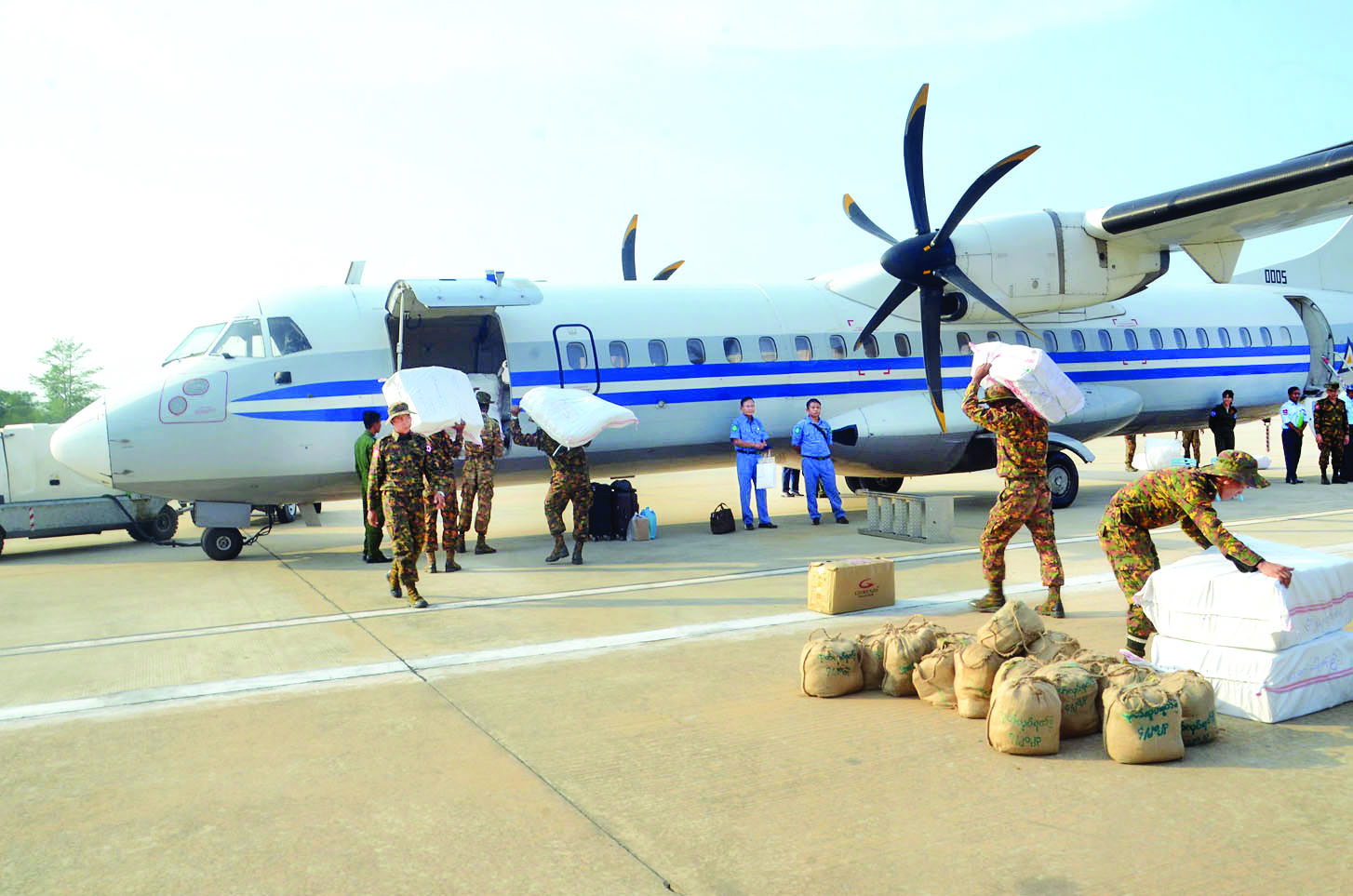 မိုခါမုန်တိုင်းအလွန် ရခိုင်ပြည်နယ်အတွင်းရှိ ဒေသခံပြည်သူများအတွက် ကူညီကယ်ဆယ်ရေး နှင့် ပြန်လည်ထူထောင်ရေးပစ္စည်းများကို တပ်မတော်ရေယာဉ်နှင့် လေယာဉ်များဖြင့်ပို့ဆောင်ပေးလျက်ရှိရာ မေ ၁၅ ရက်မှ ဇွန် ၅ ရက်အထိ တပ်မတော်လေယာဉ်များဖြင့် ၁၁၄ ကြိမ်၊ ကုန်တန်ချိန် ၃၈၁ ဒသမ ၉၂၈ တန်၊ တပ်မတော်ရေယာဉ်ဖြင့် ၁၁ ကြိမ်၊ ပုဂ္ဂလိကပိုင်ကုန်တင်ရေယာဉ်ဖြင့် ၉ ကြိမ် စုစုပေါင်း ၁၆၂၉၈ ဒသမ ၆ တန် ပို့ဆောင်ပေးနိုင်ခဲ့ပြီး အဆိုပါ ကုန်ပစ္စည်းများကို တပ်မတော်ရေယာဉ်များဖြင့် ၁၇ ကြိမ်၊ ကုန် တန်ချိန် ၈၁၅ ဒသမ ၂၄ တန် ကုန်တင်မော်တော်ယာဉ်များနှင့် ပြည်တွင်းရေကြောင်း ပို့ဆောင်ရေးမှရေယာဉ်များဖြင့် ၁၄၈၇ ဒသမ ၆၃ တန်တို့အားဘေးသင့်ဒေသများသို့ အချိန်နှင့်တစ်ပြေးညီ ဆက်လက်ဖြန့်ခွဲပို့ဆောင်ပေး ခဲ့ပြီး ဆက်လက်ရောက်ရှိလာမည့် ကုန်ပစ္စည်းများကိုလည်း အလားတူပေးပို့သွားမည်ဖြစ်ကြောင်း သတင်းရရှိသည်။