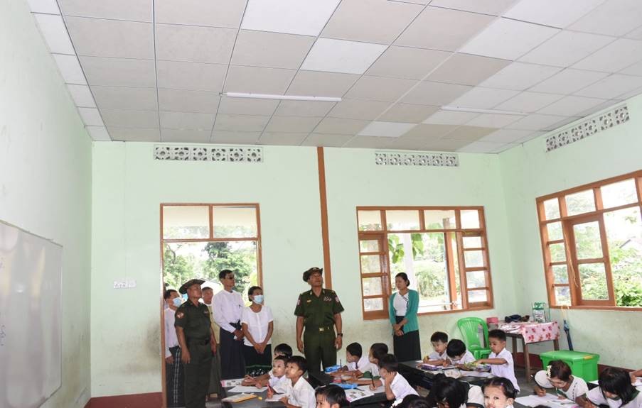 အလားတူမြို့နယ်(၂၆)မြို့နယ်၌ မိုခါမုန်တိုင်းတိုက်ခတ်မှုကြောင့် ပျက်စီးမှုများ ဖြစ်ပေါ်ခဲ့သည့် နေရာများတွင် သက်ဆိုင်ရာ မြို့နယ်များအလိုက် နယ်မြေခံတပ်မတော်သားများက ဌာနဆိုင်ရာ ဝန်ထမ်းများနှင့်ပူးပေါင်း၍ ပြန်လည်ပြုပြင်မွမ်းမံခြင်းလုပ်ငန်း ဆောင်ရွက်ပေးနေမှု အခြေအနေများ ရာနှုန်းပြည့်ပြုပြင်ပြီးစီးမှုကို တိုင်းစစ်ဌာနချုပ်မှ တာဝန်ရှိသူများနှင့် သက်ဆိုင်ရာမြို့နယ်များအလိုက် တာဝန်ရှိသူများက သွားရောက်ကြည့်ရှုစစ်ဆေးပြီး ကျောင်းသား၊ ကျောင်းသူများ စိတ်အေးချမ်းသာစွာ ပညာသင်ကြားနေမှုများကိုကြည့်ရှု၍ လိုအပ်သည်များ ညှိနှိုင်းဆောင်ရွက်ပေးခဲ့ကြောင်း သတင်းရရှိသည်။