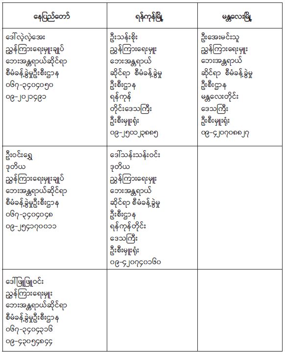 ၆။ လှူဒါန်းလိုသူများအနေဖြင့် အောက်ပါပုဂ္ဂိုလ်များသို့ ဆက်သွယ် မေးမြန်းလှူဒါန်းနိုင်ပါသည်-