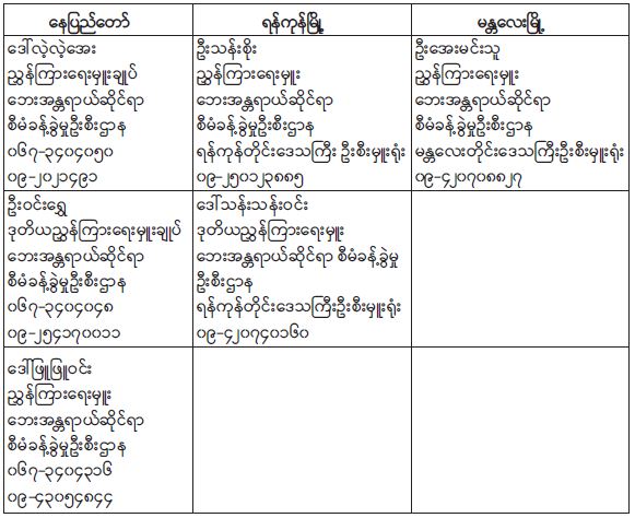 ၆။ လှူဒါန်းလိုသူများအနေဖြင့် အောက်ပါပုဂ္ဂိုလ်များသို့ ဆက်သွယ်မေးမြန်းလှူဒါန်းနိုင်ပါသည်-