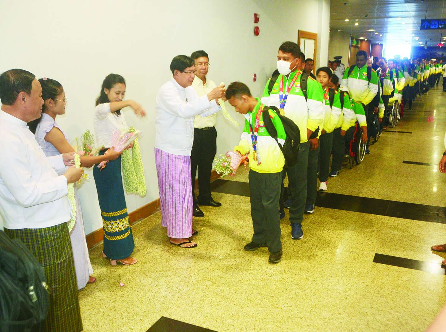 ကမ္ဘောဒီးယားနိုင်ငံ ဖနောင်ပင်မြို့ တွင် ဇွန် ၃ ရက်မှ ၉ ရက်အထိ ကျင်းပခဲ့သည့် (၁၂) ကြိမ်မြောက် အာဆီယံ မသန်စွမ်းသူများ အားကစားပြိုင်ပွဲတွင် ရွှေ ၁၅ ခု၊ ငွေ ၂၂ ခု၊ ကြေး ၁၉ ခု စုစုပေါင်း ဆုတံဆိပ် ၅၆ ခု ဆွတ်ခူးရရှိခဲ့သော မြန်မာမသန်စွမ်းအားကစားအဖွဲ့သည် ယနေ့ညပိုင်းက မြန်မာအမျိုးသား လေကြောင်းလိုင်းစင်းလုံးငှားလေယာဉ်ဖြင့် ပြန်လည်ရောက်ရှိလာရာ ရန်ကုန်တိုင်းဒေသကြီးဝန်ကြီးချုပ် ဦးစိုးသိန်း၊ အားကစားနှင့်လူငယ်ရေးရာဝန်ကြီးဌာန ဒုတိယဝန်ကြီးဦးမျိုးလှိုင်၊ တိုင်းဒေသကြီးဝန်ကြီး များ၊ အားကစားနှင့်ကာယပညာဦးစီးဌာနမှတာဝန်ရှိသူများ၊ မြန်မာနိုင်ငံမသန်စွမ်းသူများ အားကစားအဖွဲ့ချုပ်မှ တာဝန်ရှိသူများ၊ အားကစားနှင့်ကာယပညာ သိပ္ပံ (ရန်ကုန်)မှ ကျောင်းသား ကျောင်းသူများ၊ အားကစားသမားများ၊ မိဘဆွေမျိုးများက ရန်ကုန်အပြည်ပြည်ဆိုင်ရာလေဆိပ်၌ ကြိုဆိုနှုတ်ဆက်ကြသည်။