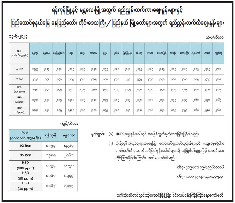 ရန်ကုန်မြို့နှင့် မန္တလေးမြို့အတွက် ရည်ညွှန်းလက်ကားဈေးနှုန်းများနှင့် ပြည်ထောင်စုနယ်မြေ နေပြည်တော်၊ တိုင်းဒေသကြီး/ပြည်နယ် မြို့တော်များအတွက် ရည်ညွှန်းလက်လီဈေးနှုန်းများ 06/13/2023