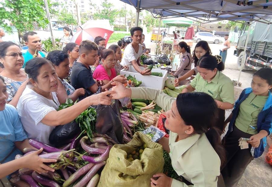 ယနေ့တွင်လည်း စစ်တွေမြို့၊ ဦးဥတ္တမပန်းခြံ၌ ဆန်၊ ဆီ၊ ဆား၊ အသား/ ငါး ကြက်ဥ၊ ဘဲဥ၊ နို့ထွက်ပစ္စည်းများ၊ ဟင်းသီးဟင်းရွက်များ၊ ကြက်သွန်နီ၊ ကြက်သွန်ဖြူနှင့် တပ်မတော်စက်ရုံများနှင့် မြန်မာစီးပွားရေးကော်ပိုရေးရှင်းတို့မှထုတ်လုပ်သည့် ခေါက်ဆွဲခြောက်၊ ဘီစကွတ်နှင့် စည်သွပ်ဘူးများဖြစ်သည့် အမဲသားဘူး၊ မျှစ်စားတော်ပဲဘူး၊ ကြက်သား အာလူးဘူး၊ ငါးတန်အချိုပေါင်းဘူး၊ ငါးသလောက်ဘူး၊ ငပိကြော်ဘူး၊ ပဲထောပတ်ဘူး၊ ပဲခရမ်းဘူး၊ သရက်သီးသနပ်ဘူး စသည့်စားသောက်ကုန်များ၊ ပုဂ္ဂလိကလုပ်ငန်းရှင်များ၏ စားကုန်ပစ္စည်းများ၊ လျှပ်စစ်ပစ္စည်းများနှင့် အိမ်ဆောက်ပစ္စည်းများကို ပြင်ပပေါက်ဈေးထက်သက်သာသော ဈေးနှုန်းများဖြင့် ဆက်လက်ရောင်းချပေးခဲ့ရာ ဒေသခံပြည်သူများနှင့် ဌာနဆိုင်ရာဝန်ထမ်း မိသားစုများက တစ်ခဲနက်ဝယ်ယူ အားပေးကြောင်းနှင့် ယခုကဲ့သို့ စားရေးအခက်အခဲ ဖြစ်ပေါ်နေချိန်တွင် သက်သာသောဈေးနှုန်းများဖြင့် ရောင်းချပေးမှုအပေါ် တာဝန်ရှိသူများအား အထူးပင်ကျေးဇူးတင်ရှိကြောင်း သတင်းရရှိသည်။