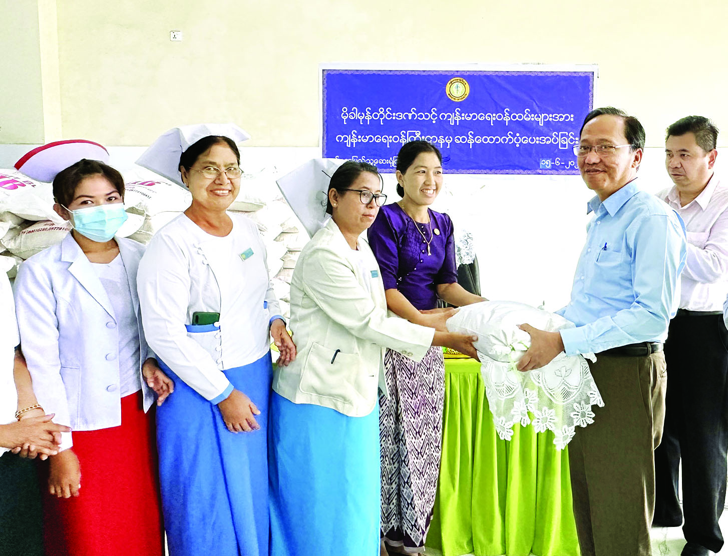 ကျန်းမာရေးဝန်ကြီးဌာန ပြည်ထောင်စုဝန်ကြီး ပါမောက္ခ ဒေါက်တာ သက်ခိုင်ဝင်းသည် ကျန်းမာရေး လူ့စွမ်းအားအရင်းအမြစ်ဦးစီးဌာန ညွှန်ကြားရေးမှူးချုပ် ဒေါက်တာတင်ထွန်း၊ တာဝန်ရှိသူများနှင့်အတူ ယနေ့နံနက်ပိုင်းတွင် စစ်တွေမြို့ ပြည်သူ့ဆေးရုံကြီး၌ ကျင်းပပြုလုပ်သည့် မိုခါမုန်တိုင်းဒဏ်သင့် ကျန်းမာရေးဝန်ထမ်းများအား ဆန်များ ထောက်ပံ့ပေးအပ်ခြင်း အခမ်းအနားသို့ တက်ရောက်သည်။