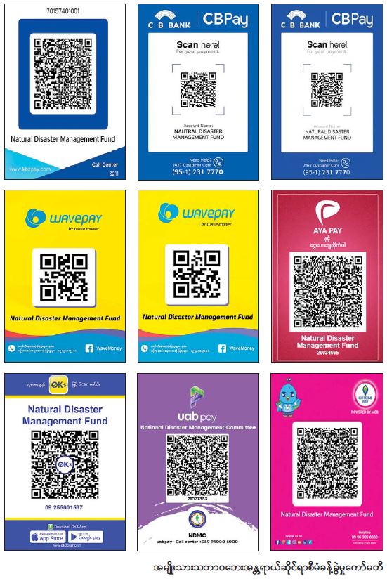 ၅။ ယခုအခါ ပြည်သူများလှူဒါန်းမှုပြုလုပ်ရာတွင် ပိုမိုအဆင်ပြေစေရေး ပြည်သူများအသုံးပြုမှု များပြားသည့် CB Pay ၊ AYA Pay၊ OK $ ၊ UAB pay နှင့် Citizens Pay တို့ဖြင့်လည်း လှူဒါန်းနိုင်ရေး ဆောင်ရွက်ထားပြီးဖြစ်သဖြင့် QR အား Scan ဖတ်ခြင်း၊ QR တွင်ပါဝင်သော ကုတ်နံပါတ်အား ရိုက်ထည့်၍ လှူဒါန်းခြင်းများ ဆောင်ရွက်နိုင်ပါသည်။