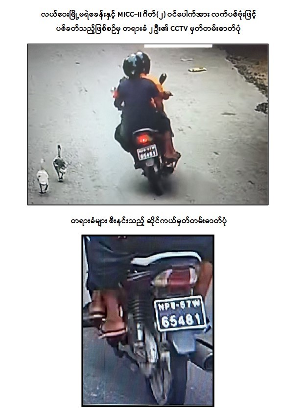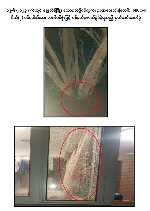 အလားတူ ယင်းနေ့ညပိုင်းတွင် သက်နိုင်၊ ရဲနိုင်နှင့် တရားခံပြေး အသေးလေး တို့ ၃ ဦးသည် ဆိုင်ကယ် ၂ စီးဖြင့် MICC-II သို့ သွားရောက်ခဲ့ပြီး ရဲနိုင် မှ အခြေအနေကြည့်ရှုပေးကာ တရားခံပြေး အသေးလေး နှင့် သက်နိုင် တို့ ၂ ဦးမှ MICC-II ဂိတ်(၂) ဝင်ပေါက်အား လက်ပစ်ဗုံး ၁ လုံးဖြင့် ပစ်ပေါက်ထွက်ပြေးခဲ့ကြောင်း ဖော်ထုတ်သိရှိ ရသည်။