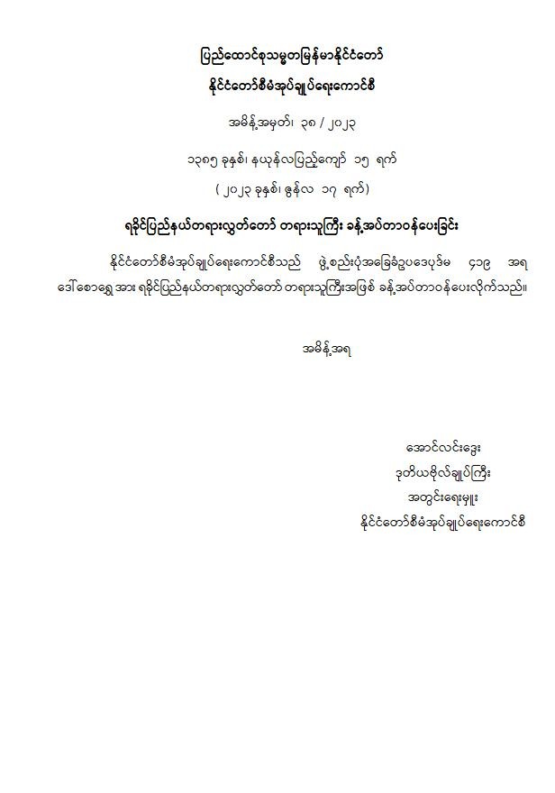 ရခိုင်ပြည်နယ်တရားလွှတ်တော် တရားသူကြီး ခန့်အပ်တာဝန်ပေးခြင်း 06/18/2023 ပြည်ထောင်စုသမ္မတမြန်မာနိုင်ငံတော် နိုင်ငံတော်စီမံအုပ်ချုပ်ရေးကောင်စီ အမိန့်အမှတ်၊ ၃၈ / ၂၀၂၃ ၁၃၈၅ ခုနှစ်၊ နယုန်လပြည့်ကျော် ၁၅ ရက် ( ၂၀၂၃ ခုနှစ်၊ ဇွန်လ ၁၇ ရက်) ရခိုင်ပြည်နယ်တရားလွှတ်တော် တရားသူကြီး ခန့်အပ်တာဝန်ပေးခြင်း
