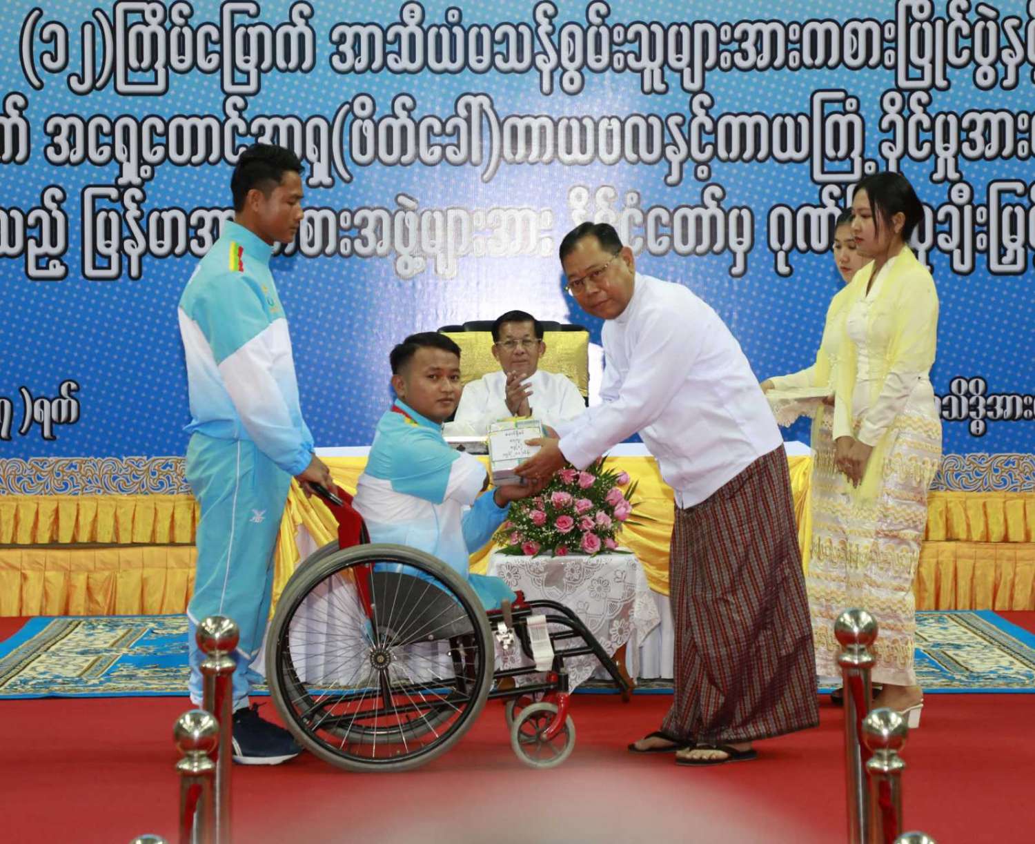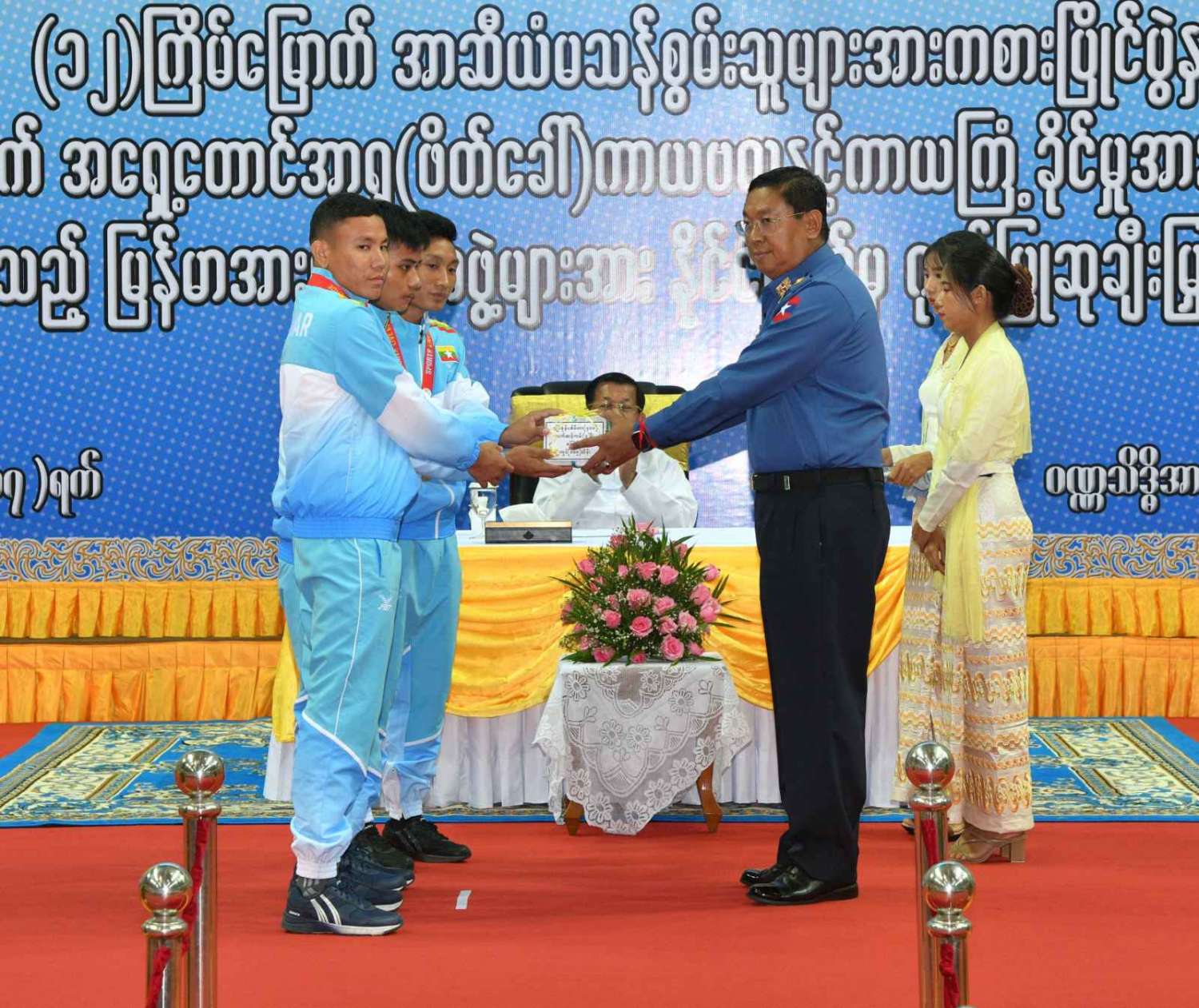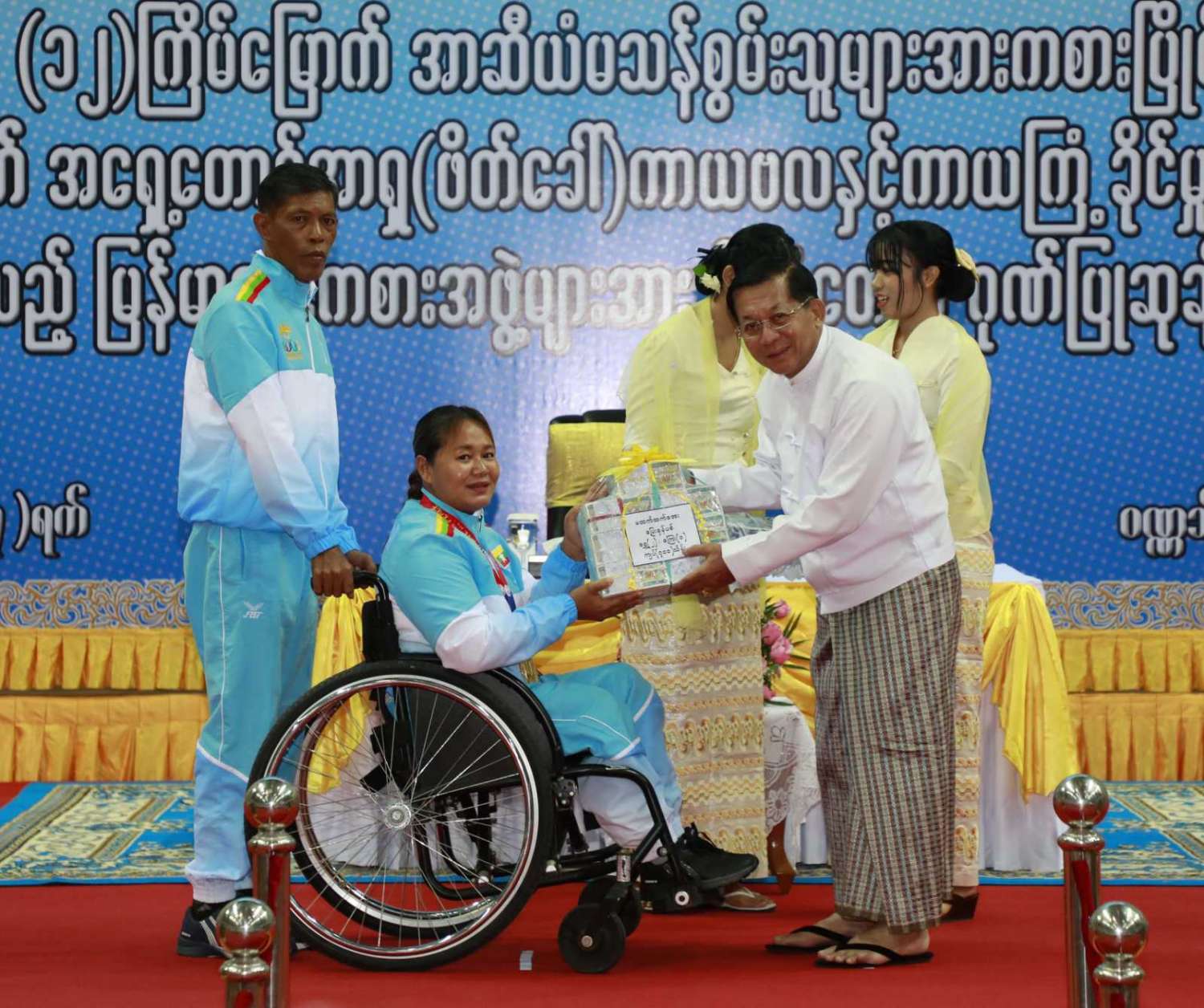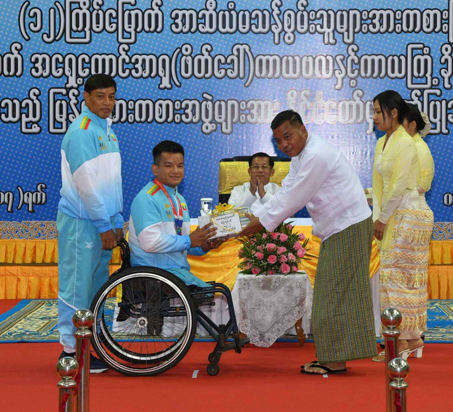 ထို့နောက် (၁၂)ကြိမ်မြောက် အာဆီယံမသန်စွမ်းသူများ အားကစားပြိုင်ပွဲတွင် ဆုတံဆိပ်ရရှိခဲ့သည့် နိုင်ငံ့ဂုဏ်ဆောင် ဆုရအားကစားသမားများ၊ နည်းပြများနှင့် အုပ်ချုပ်သူများကို ဂုဏ်ပြုဆုငွေများ ပေးအပ်ချီးမြှင့်ရာ နိုင်ငံတော်စီမံအုပ်ချုပ်ရေး ကောင်စီဥက္ကဋ္ဌ နိုင်ငံတော်ဝန်ကြီးချုပ်က ရေကူးအားကစားနည်းတွင် ရွှေတံဆိပ် ၂ ခုနှင့် ငွေတံဆိပ် ၂ ခုရရှိခဲ့သည့် မောင်အောင်မြင့်မြတ် ၊ ပြေးခုန်ပစ်အားကစားနည်း၊ မီတာ ၈၀၀ ပြိုင်ပွဲတွင် ရွှေတံဆိပ် ၁ ခု၊ မီတာ ၁၅၀၀ ပြိုင်ပွဲတွင် ရွှေတံဆိပ် ၁ ခုနှင့် မီတာ ၄၀၀ ပြိုင်ပွဲတွင် ငွေတံဆိပ် ၁ ခုရရှိခဲ့သည့် ဒုတိယတပ်ကြပ် မောင်လင်း၊ သံလုံးပစ်ပြိုင်ပွဲနှင့် လှံတံပစ်ပြိုင်ပွဲတို့တွင် ရွှေတံဆိပ် ၂ ခုနှင့် သံပြားပစ်ပြိုင်ပွဲတွင် ငွေတံဆိပ် ၁ ခုရရှိခဲ့သည့် တပ်ကြပ်ကြီး တင်ညို၊ သံလုံးပစ်ပြိုင်ပွဲနှင့် သံပြားပစ်ပြိုင်ပွဲတို့တွင် ရွှေတံဆိပ် ၂ ခုနှင့် လှံတံပစ်ပြိုင်ပွဲတွင် ကြေးတံဆိပ် ၁ ခုရရှိခဲ့သည့် မထက်ထက်အေး၊ သံလုံးပစ်ပြိုင်ပွဲနှင့် လှံတံပစ်ပြိုင်ပွဲတွင် ရွှေတံဆိပ် ၂ ခုရရှိခဲ့သည့် မစိန်ဖော့၊ ပြေးခုန်ပစ် အားကစားနည်း မီတာ ၁၀၀ အပြေးပြိုင်ပွဲတွင် ရွှေတံဆိပ် ၁ ခု၊ မီတာ ၂၀၀ ပြိုင်ပွဲတွင် ငွေတံဆိပ် ၁ ခု၊ မီတာ ၄၀၀ ပြိုင်ပွဲတွင် ကြေးတံဆိပ် ၁ ခုနှင့် မီတာ ၄၀၀ လက်ဆင့် ကမ်းပြိုင်ပွဲတွင် ကြေးတံဆိပ် ၁ ခုရရှိခဲ့သည့် တပ်ကြပ်စိုးပေ၊ ရေကူးအားကစားနည်း မီတာ ၅၀ ရင်ဘောင်တန်းကူးပြိုင်ပွဲတွင် ရွှေတံဆိပ် ၁ ခု၊ မီတာ ၁၀၀ ပက်လက်ကူး ပြိုင်ပွဲတွင် ငွေတံဆိပ် ၁ ခုရရှိခဲ့သည့် မောင်မင်းထူး၊ သံလုံးပစ်ပြိုင်ပွဲတွင် ရွှေတံဆိပ် ၁ ခု၊ သံပြားပစ်ပြိုင်ပွဲတွင် ငွေတံဆိပ် ၁ ခုရရှိခဲ့သည့် မောင်အောင်ဘုန်းမြတ်၊ သံပြားပစ် ပြိုင်ပွဲတွင် ရွှေတံဆိပ် ၁ ခု၊ သံလုံးပစ်ပြိုင်ပွဲတွင် ငွေတံဆိပ် ၁ ခုရရှိခဲ့သည့် ဒုတိယ တပ်ကြပ် အောင်ထွန်းလင်း၊ သံပြားပစ်ပြိုင်ပွဲတွင် ရွှေတံဆိပ် ၁ ခုရရှိခဲ့သည့် ဒုတိယ တပ်ကြပ် ရဲမင်းစိုး၊ (၁၇)ကြိမ်မြောက် အရှေ့တောင် အာရှ(ဖိတ်ခေါ်) ကာယဗလနှင့် ကာယကြံ့ခိုင်မှု အားကစား ပြိုင်ပွဲတွင် ရွှေတံဆိပ် ၁ ခု ရရှိခဲ့သည့် မောင်ငြိမ်းချမ်းတို့အား ဂုဏ်ပြုဆုငွေများပေးအပ်ချီးမြှင့်သည်။