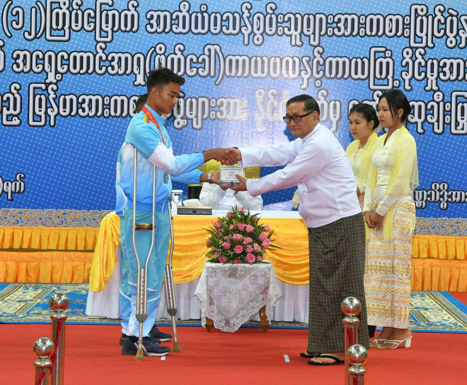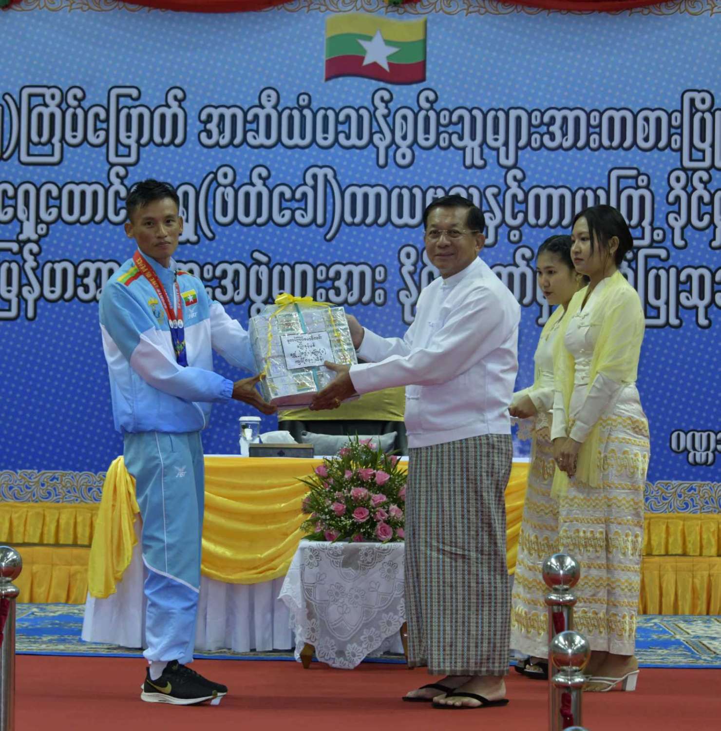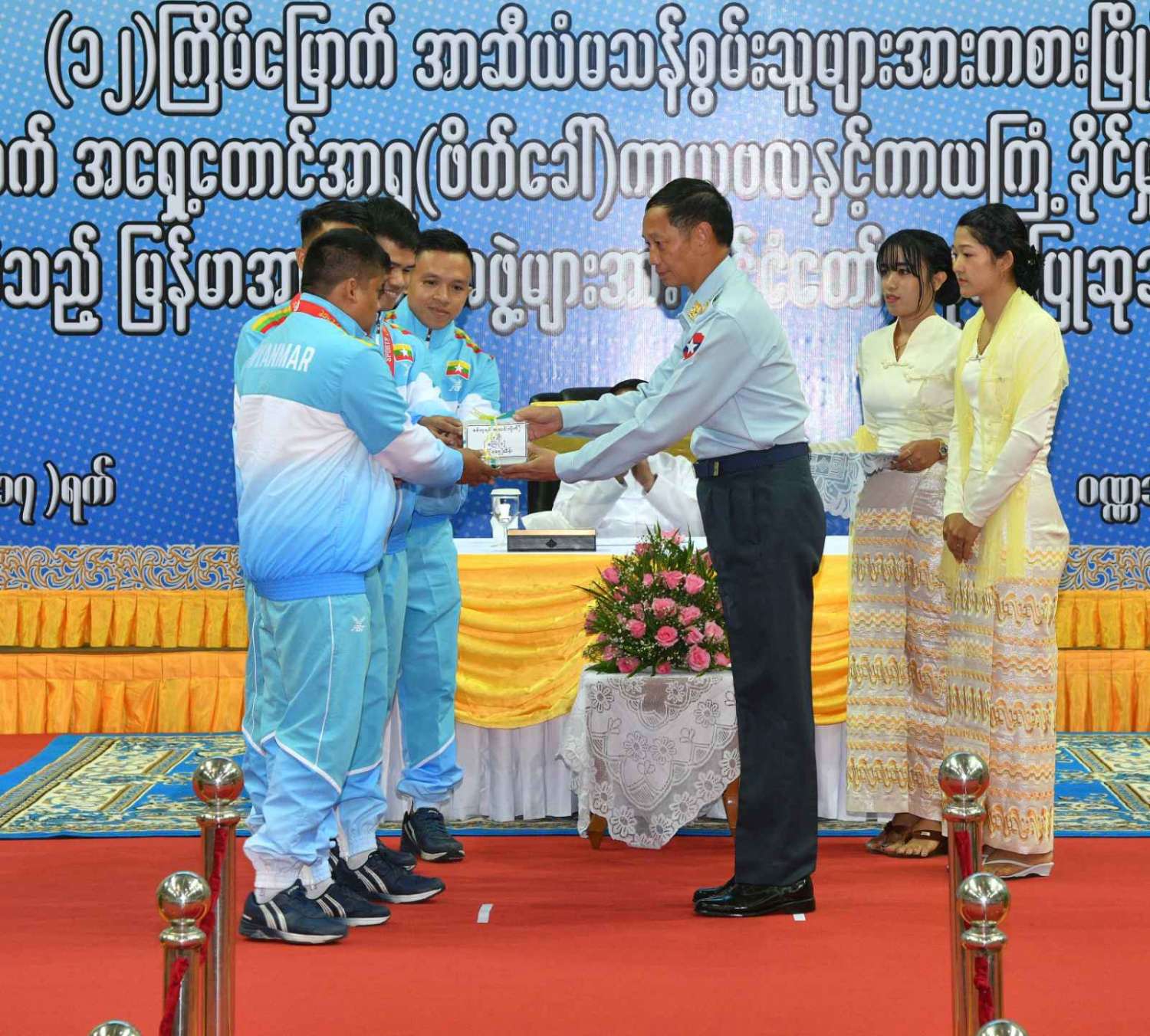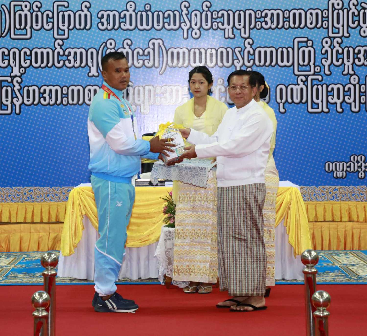 ထို့နောက် (၁၂)ကြိမ်မြောက် အာဆီယံမသန်စွမ်းသူများ အားကစားပြိုင်ပွဲတွင် ဆုတံဆိပ်ရရှိခဲ့သည့် နိုင်ငံ့ဂုဏ်ဆောင် ဆုရအားကစားသမားများ၊ နည်းပြများနှင့် အုပ်ချုပ်သူများကို ဂုဏ်ပြုဆုငွေများ ပေးအပ်ချီးမြှင့်ရာ နိုင်ငံတော်စီမံအုပ်ချုပ်ရေး ကောင်စီဥက္ကဋ္ဌ နိုင်ငံတော်ဝန်ကြီးချုပ်က ရေကူးအားကစားနည်းတွင် ရွှေတံဆိပ် ၂ ခုနှင့် ငွေတံဆိပ် ၂ ခုရရှိခဲ့သည့် မောင်အောင်မြင့်မြတ် ၊ ပြေးခုန်ပစ်အားကစားနည်း၊ မီတာ ၈၀၀ ပြိုင်ပွဲတွင် ရွှေတံဆိပ် ၁ ခု၊ မီတာ ၁၅၀၀ ပြိုင်ပွဲတွင် ရွှေတံဆိပ် ၁ ခုနှင့် မီတာ ၄၀၀ ပြိုင်ပွဲတွင် ငွေတံဆိပ် ၁ ခုရရှိခဲ့သည့် ဒုတိယတပ်ကြပ် မောင်လင်း၊ သံလုံးပစ်ပြိုင်ပွဲနှင့် လှံတံပစ်ပြိုင်ပွဲတို့တွင် ရွှေတံဆိပ် ၂ ခုနှင့် သံပြားပစ်ပြိုင်ပွဲတွင် ငွေတံဆိပ် ၁ ခုရရှိခဲ့သည့် တပ်ကြပ်ကြီး တင်ညို၊ သံလုံးပစ်ပြိုင်ပွဲနှင့် သံပြားပစ်ပြိုင်ပွဲတို့တွင် ရွှေတံဆိပ် ၂ ခုနှင့် လှံတံပစ်ပြိုင်ပွဲတွင် ကြေးတံဆိပ် ၁ ခုရရှိခဲ့သည့် မထက်ထက်အေး၊ သံလုံးပစ်ပြိုင်ပွဲနှင့် လှံတံပစ်ပြိုင်ပွဲတွင် ရွှေတံဆိပ် ၂ ခုရရှိခဲ့သည့် မစိန်ဖော့၊ ပြေးခုန်ပစ် အားကစားနည်း မီတာ ၁၀၀ အပြေးပြိုင်ပွဲတွင် ရွှေတံဆိပ် ၁ ခု၊ မီတာ ၂၀၀ ပြိုင်ပွဲတွင် ငွေတံဆိပ် ၁ ခု၊ မီတာ ၄၀၀ ပြိုင်ပွဲတွင် ကြေးတံဆိပ် ၁ ခုနှင့် မီတာ ၄၀၀ လက်ဆင့် ကမ်းပြိုင်ပွဲတွင် ကြေးတံဆိပ် ၁ ခုရရှိခဲ့သည့် တပ်ကြပ်စိုးပေ၊ ရေကူးအားကစားနည်း မီတာ ၅၀ ရင်ဘောင်တန်းကူးပြိုင်ပွဲတွင် ရွှေတံဆိပ် ၁ ခု၊ မီတာ ၁၀၀ ပက်လက်ကူး ပြိုင်ပွဲတွင် ငွေတံဆိပ် ၁ ခုရရှိခဲ့သည့် မောင်မင်းထူး၊ သံလုံးပစ်ပြိုင်ပွဲတွင် ရွှေတံဆိပ် ၁ ခု၊ သံပြားပစ်ပြိုင်ပွဲတွင် ငွေတံဆိပ် ၁ ခုရရှိခဲ့သည့် မောင်အောင်ဘုန်းမြတ်၊ သံပြားပစ် ပြိုင်ပွဲတွင် ရွှေတံဆိပ် ၁ ခု၊ သံလုံးပစ်ပြိုင်ပွဲတွင် ငွေတံဆိပ် ၁ ခုရရှိခဲ့သည့် ဒုတိယ တပ်ကြပ် အောင်ထွန်းလင်း၊ သံပြားပစ်ပြိုင်ပွဲတွင် ရွှေတံဆိပ် ၁ ခုရရှိခဲ့သည့် ဒုတိယ တပ်ကြပ် ရဲမင်းစိုး၊ (၁၇)ကြိမ်မြောက် အရှေ့တောင် အာရှ(ဖိတ်ခေါ်) ကာယဗလနှင့် ကာယကြံ့ခိုင်မှု အားကစား ပြိုင်ပွဲတွင် ရွှေတံဆိပ် ၁ ခု ရရှိခဲ့သည့် မောင်ငြိမ်းချမ်းတို့အား ဂုဏ်ပြုဆုငွေများပေးအပ်ချီးမြှင့်သည်။