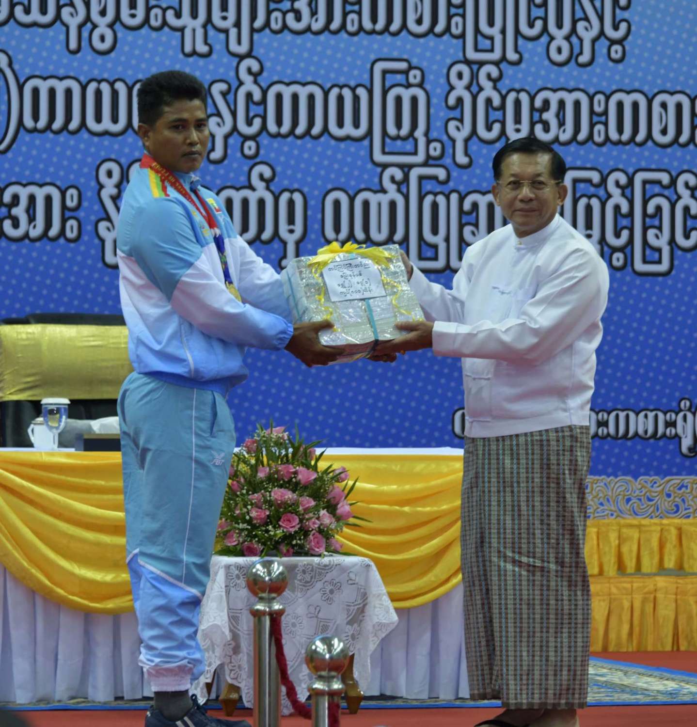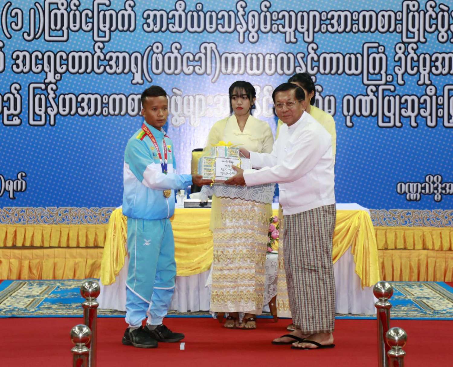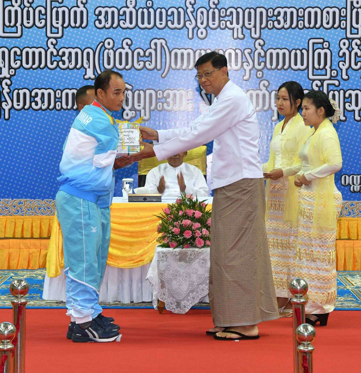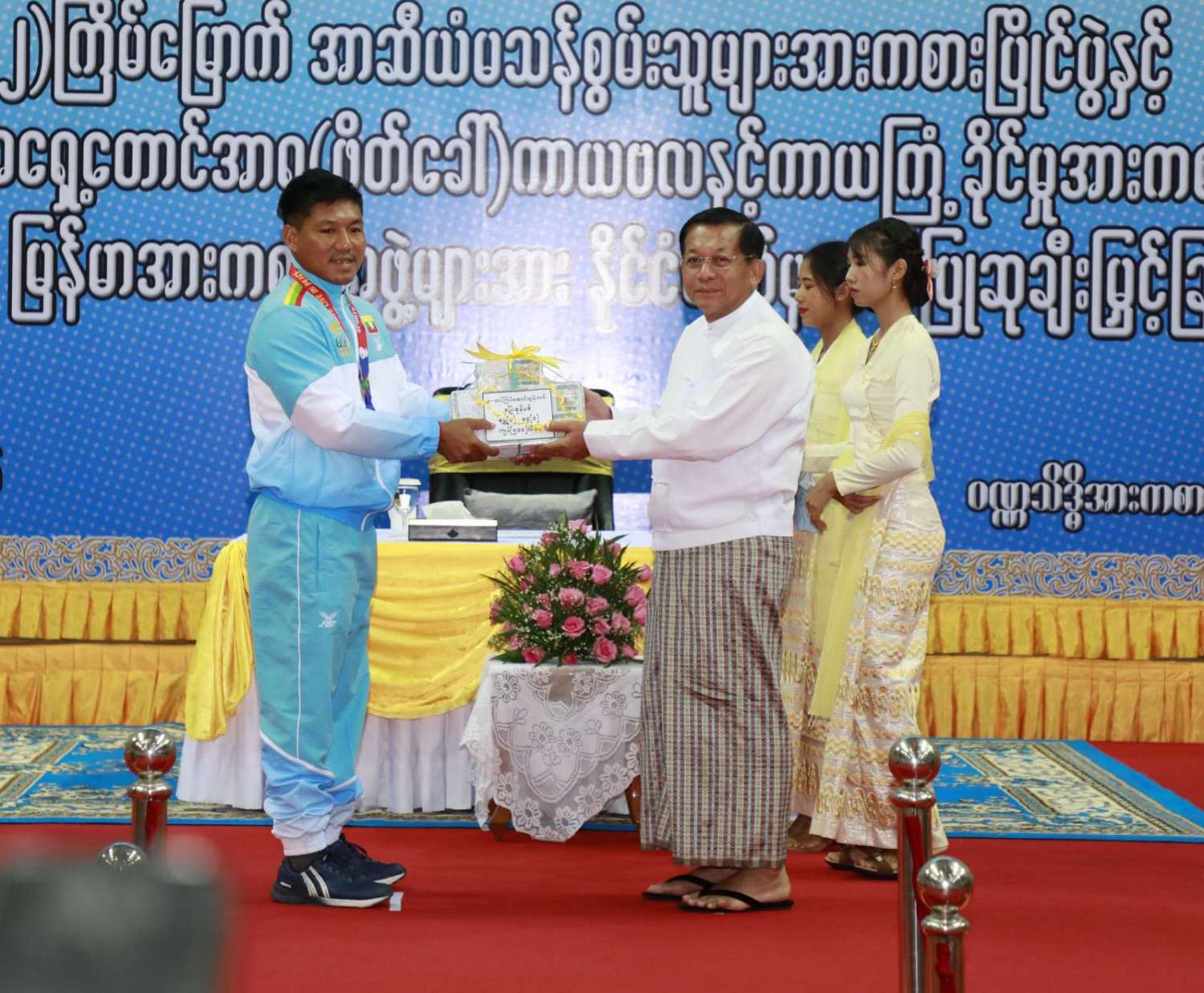 ထို့နောက် (၁၂)ကြိမ်မြောက် အာဆီယံမသန်စွမ်းသူများ အားကစားပြိုင်ပွဲတွင် ဆုတံဆိပ်ရရှိခဲ့သည့် နိုင်ငံ့ဂုဏ်ဆောင် ဆုရအားကစားသမားများ၊ နည်းပြများနှင့် အုပ်ချုပ်သူများကို ဂုဏ်ပြုဆုငွေများ ပေးအပ်ချီးမြှင့်ရာ နိုင်ငံတော်စီမံအုပ်ချုပ်ရေး ကောင်စီဥက္ကဋ္ဌ နိုင်ငံတော်ဝန်ကြီးချုပ်က ရေကူးအားကစားနည်းတွင် ရွှေတံဆိပ် ၂ ခုနှင့် ငွေတံဆိပ် ၂ ခုရရှိခဲ့သည့် မောင်အောင်မြင့်မြတ် ၊ ပြေးခုန်ပစ်အားကစားနည်း၊ မီတာ ၈၀၀ ပြိုင်ပွဲတွင် ရွှေတံဆိပ် ၁ ခု၊ မီတာ ၁၅၀၀ ပြိုင်ပွဲတွင် ရွှေတံဆိပ် ၁ ခုနှင့် မီတာ ၄၀၀ ပြိုင်ပွဲတွင် ငွေတံဆိပ် ၁ ခုရရှိခဲ့သည့် ဒုတိယတပ်ကြပ် မောင်လင်း၊ သံလုံးပစ်ပြိုင်ပွဲနှင့် လှံတံပစ်ပြိုင်ပွဲတို့တွင် ရွှေတံဆိပ် ၂ ခုနှင့် သံပြားပစ်ပြိုင်ပွဲတွင် ငွေတံဆိပ် ၁ ခုရရှိခဲ့သည့် တပ်ကြပ်ကြီး တင်ညို၊ သံလုံးပစ်ပြိုင်ပွဲနှင့် သံပြားပစ်ပြိုင်ပွဲတို့တွင် ရွှေတံဆိပ် ၂ ခုနှင့် လှံတံပစ်ပြိုင်ပွဲတွင် ကြေးတံဆိပ် ၁ ခုရရှိခဲ့သည့် မထက်ထက်အေး၊ သံလုံးပစ်ပြိုင်ပွဲနှင့် လှံတံပစ်ပြိုင်ပွဲတွင် ရွှေတံဆိပ် ၂ ခုရရှိခဲ့သည့် မစိန်ဖော့၊ ပြေးခုန်ပစ် အားကစားနည်း မီတာ ၁၀၀ အပြေးပြိုင်ပွဲတွင် ရွှေတံဆိပ် ၁ ခု၊ မီတာ ၂၀၀ ပြိုင်ပွဲတွင် ငွေတံဆိပ် ၁ ခု၊ မီတာ ၄၀၀ ပြိုင်ပွဲတွင် ကြေးတံဆိပ် ၁ ခုနှင့် မီတာ ၄၀၀ လက်ဆင့် ကမ်းပြိုင်ပွဲတွင် ကြေးတံဆိပ် ၁ ခုရရှိခဲ့သည့် တပ်ကြပ်စိုးပေ၊ ရေကူးအားကစားနည်း မီတာ ၅၀ ရင်ဘောင်တန်းကူးပြိုင်ပွဲတွင် ရွှေတံဆိပ် ၁ ခု၊ မီတာ ၁၀၀ ပက်လက်ကူး ပြိုင်ပွဲတွင် ငွေတံဆိပ် ၁ ခုရရှိခဲ့သည့် မောင်မင်းထူး၊ သံလုံးပစ်ပြိုင်ပွဲတွင် ရွှေတံဆိပ် ၁ ခု၊ သံပြားပစ်ပြိုင်ပွဲတွင် ငွေတံဆိပ် ၁ ခုရရှိခဲ့သည့် မောင်အောင်ဘုန်းမြတ်၊ သံပြားပစ် ပြိုင်ပွဲတွင် ရွှေတံဆိပ် ၁ ခု၊ သံလုံးပစ်ပြိုင်ပွဲတွင် ငွေတံဆိပ် ၁ ခုရရှိခဲ့သည့် ဒုတိယ တပ်ကြပ် အောင်ထွန်းလင်း၊ သံပြားပစ်ပြိုင်ပွဲတွင် ရွှေတံဆိပ် ၁ ခုရရှိခဲ့သည့် ဒုတိယ တပ်ကြပ် ရဲမင်းစိုး၊ (၁၇)ကြိမ်မြောက် အရှေ့တောင် အာရှ(ဖိတ်ခေါ်) ကာယဗလနှင့် ကာယကြံ့ခိုင်မှု အားကစား ပြိုင်ပွဲတွင် ရွှေတံဆိပ် ၁ ခု ရရှိခဲ့သည့် မောင်ငြိမ်းချမ်းတို့အား ဂုဏ်ပြုဆုငွေများပေးအပ်ချီးမြှင့်သည်။