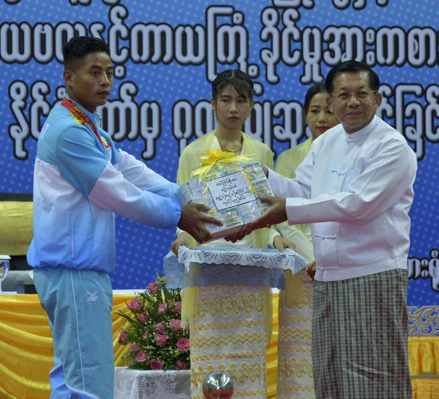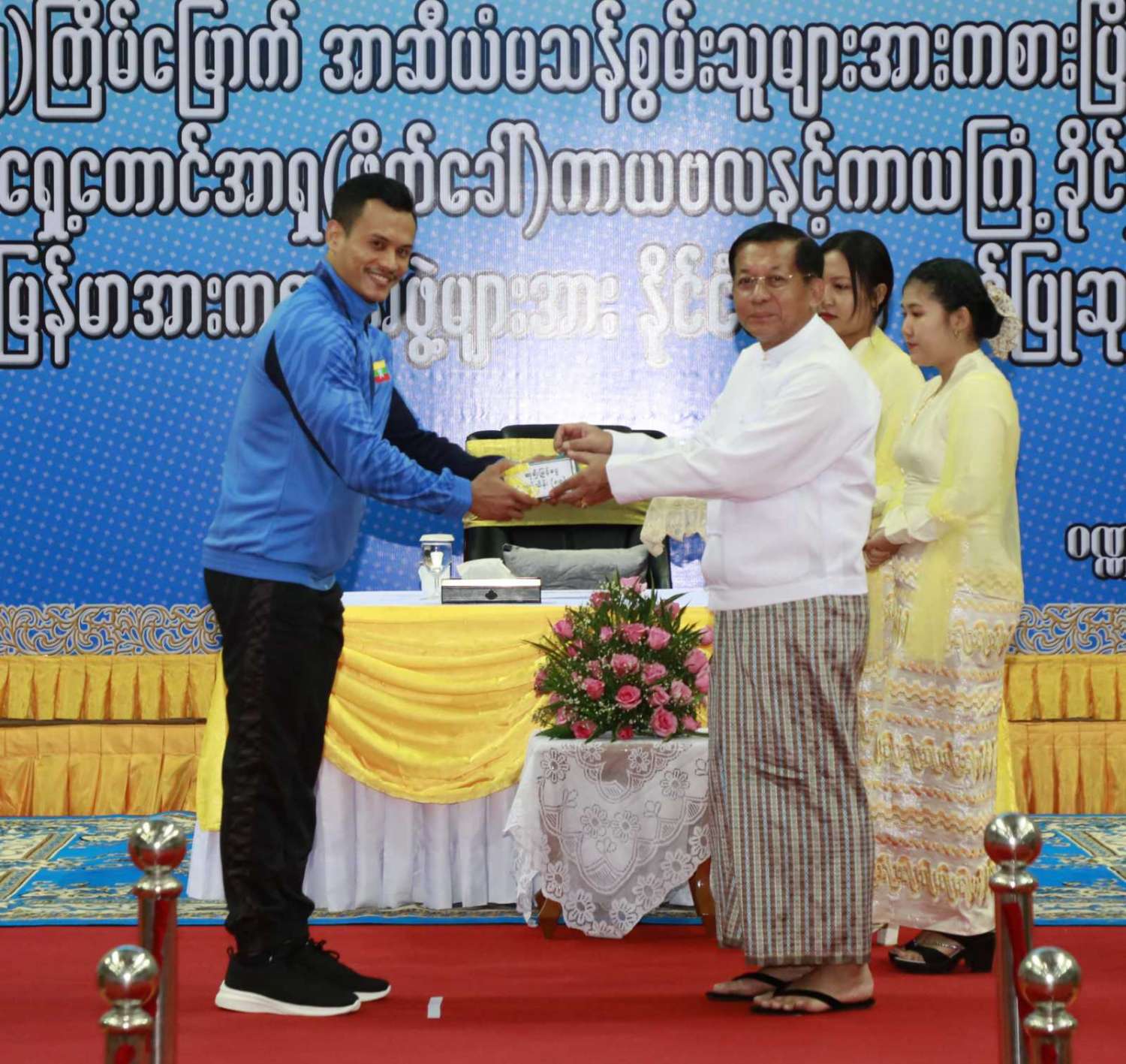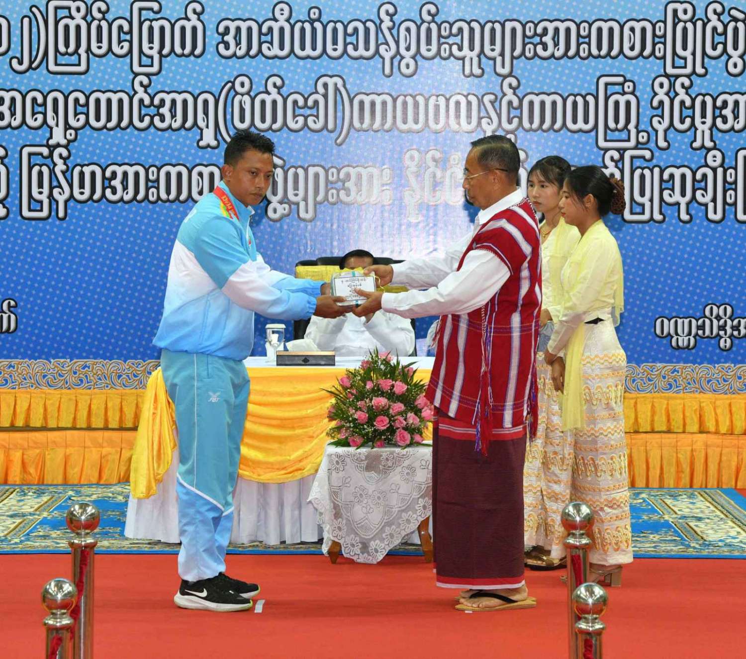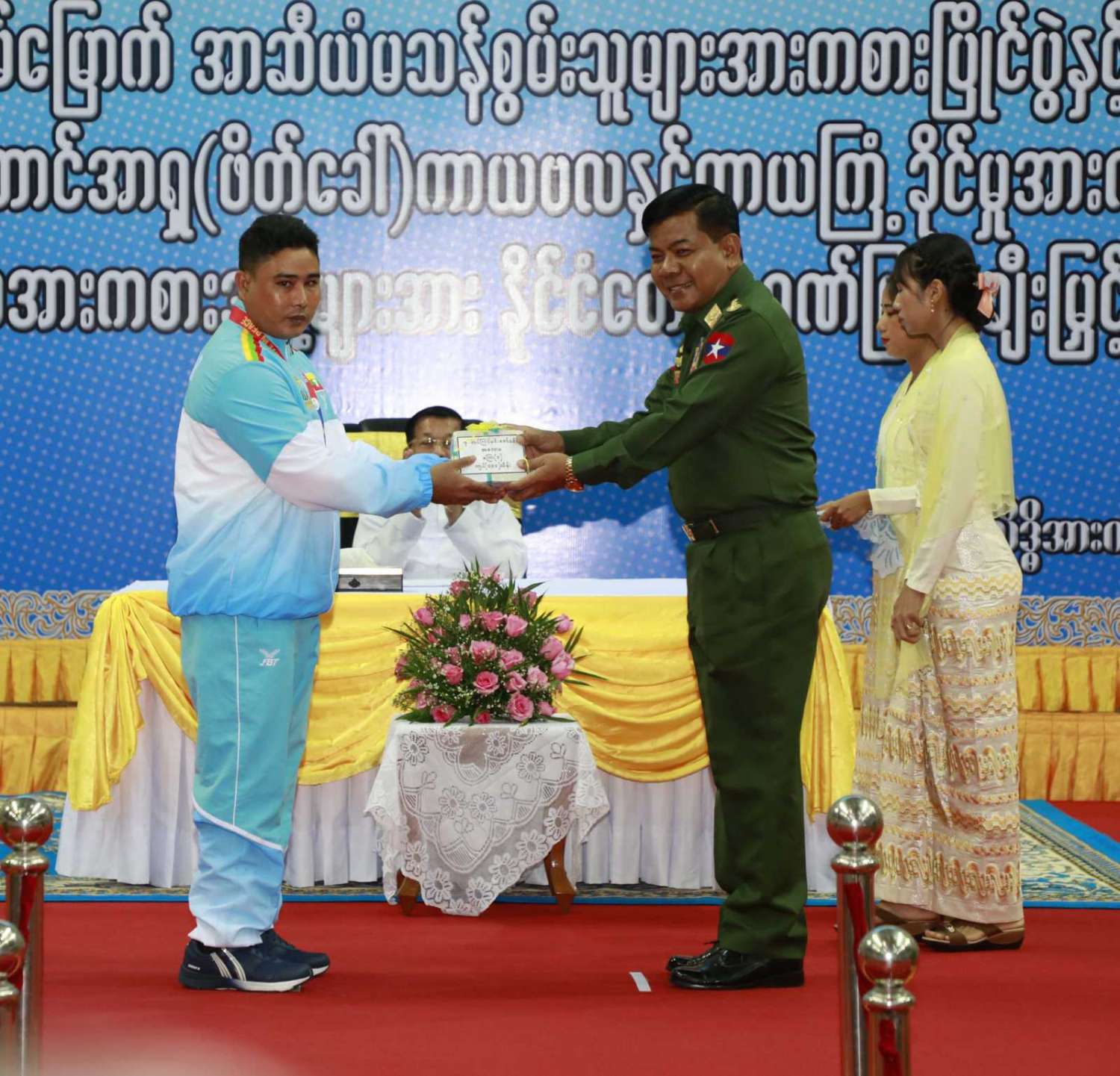 ထို့နောက် (၁၂)ကြိမ်မြောက် အာဆီယံမသန်စွမ်းသူများ အားကစားပြိုင်ပွဲတွင် ဆုတံဆိပ်ရရှိခဲ့သည့် နိုင်ငံ့ဂုဏ်ဆောင် ဆုရအားကစားသမားများ၊ နည်းပြများနှင့် အုပ်ချုပ်သူများကို ဂုဏ်ပြုဆုငွေများ ပေးအပ်ချီးမြှင့်ရာ နိုင်ငံတော်စီမံအုပ်ချုပ်ရေး ကောင်စီဥက္ကဋ္ဌ နိုင်ငံတော်ဝန်ကြီးချုပ်က ရေကူးအားကစားနည်းတွင် ရွှေတံဆိပ် ၂ ခုနှင့် ငွေတံဆိပ် ၂ ခုရရှိခဲ့သည့် မောင်အောင်မြင့်မြတ် ၊ ပြေးခုန်ပစ်အားကစားနည်း၊ မီတာ ၈၀၀ ပြိုင်ပွဲတွင် ရွှေတံဆိပ် ၁ ခု၊ မီတာ ၁၅၀၀ ပြိုင်ပွဲတွင် ရွှေတံဆိပ် ၁ ခုနှင့် မီတာ ၄၀၀ ပြိုင်ပွဲတွင် ငွေတံဆိပ် ၁ ခုရရှိခဲ့သည့် ဒုတိယတပ်ကြပ် မောင်လင်း၊ သံလုံးပစ်ပြိုင်ပွဲနှင့် လှံတံပစ်ပြိုင်ပွဲတို့တွင် ရွှေတံဆိပ် ၂ ခုနှင့် သံပြားပစ်ပြိုင်ပွဲတွင် ငွေတံဆိပ် ၁ ခုရရှိခဲ့သည့် တပ်ကြပ်ကြီး တင်ညို၊ သံလုံးပစ်ပြိုင်ပွဲနှင့် သံပြားပစ်ပြိုင်ပွဲတို့တွင် ရွှေတံဆိပ် ၂ ခုနှင့် လှံတံပစ်ပြိုင်ပွဲတွင် ကြေးတံဆိပ် ၁ ခုရရှိခဲ့သည့် မထက်ထက်အေး၊ သံလုံးပစ်ပြိုင်ပွဲနှင့် လှံတံပစ်ပြိုင်ပွဲတွင် ရွှေတံဆိပ် ၂ ခုရရှိခဲ့သည့် မစိန်ဖော့၊ ပြေးခုန်ပစ် အားကစားနည်း မီတာ ၁၀၀ အပြေးပြိုင်ပွဲတွင် ရွှေတံဆိပ် ၁ ခု၊ မီတာ ၂၀၀ ပြိုင်ပွဲတွင် ငွေတံဆိပ် ၁ ခု၊ မီတာ ၄၀၀ ပြိုင်ပွဲတွင် ကြေးတံဆိပ် ၁ ခုနှင့် မီတာ ၄၀၀ လက်ဆင့် ကမ်းပြိုင်ပွဲတွင် ကြေးတံဆိပ် ၁ ခုရရှိခဲ့သည့် တပ်ကြပ်စိုးပေ၊ ရေကူးအားကစားနည်း မီတာ ၅၀ ရင်ဘောင်တန်းကူးပြိုင်ပွဲတွင် ရွှေတံဆိပ် ၁ ခု၊ မီတာ ၁၀၀ ပက်လက်ကူး ပြိုင်ပွဲတွင် ငွေတံဆိပ် ၁ ခုရရှိခဲ့သည့် မောင်မင်းထူး၊ သံလုံးပစ်ပြိုင်ပွဲတွင် ရွှေတံဆိပ် ၁ ခု၊ သံပြားပစ်ပြိုင်ပွဲတွင် ငွေတံဆိပ် ၁ ခုရရှိခဲ့သည့် မောင်အောင်ဘုန်းမြတ်၊ သံပြားပစ် ပြိုင်ပွဲတွင် ရွှေတံဆိပ် ၁ ခု၊ သံလုံးပစ်ပြိုင်ပွဲတွင် ငွေတံဆိပ် ၁ ခုရရှိခဲ့သည့် ဒုတိယ တပ်ကြပ် အောင်ထွန်းလင်း၊ သံပြားပစ်ပြိုင်ပွဲတွင် ရွှေတံဆိပ် ၁ ခုရရှိခဲ့သည့် ဒုတိယ တပ်ကြပ် ရဲမင်းစိုး၊ (၁၇)ကြိမ်မြောက် အရှေ့တောင် အာရှ(ဖိတ်ခေါ်) ကာယဗလနှင့် ကာယကြံ့ခိုင်မှု အားကစား ပြိုင်ပွဲတွင် ရွှေတံဆိပ် ၁ ခု ရရှိခဲ့သည့် မောင်ငြိမ်းချမ်းတို့အား ဂုဏ်ပြုဆုငွေများပေးအပ်ချီးမြှင့်သည်။