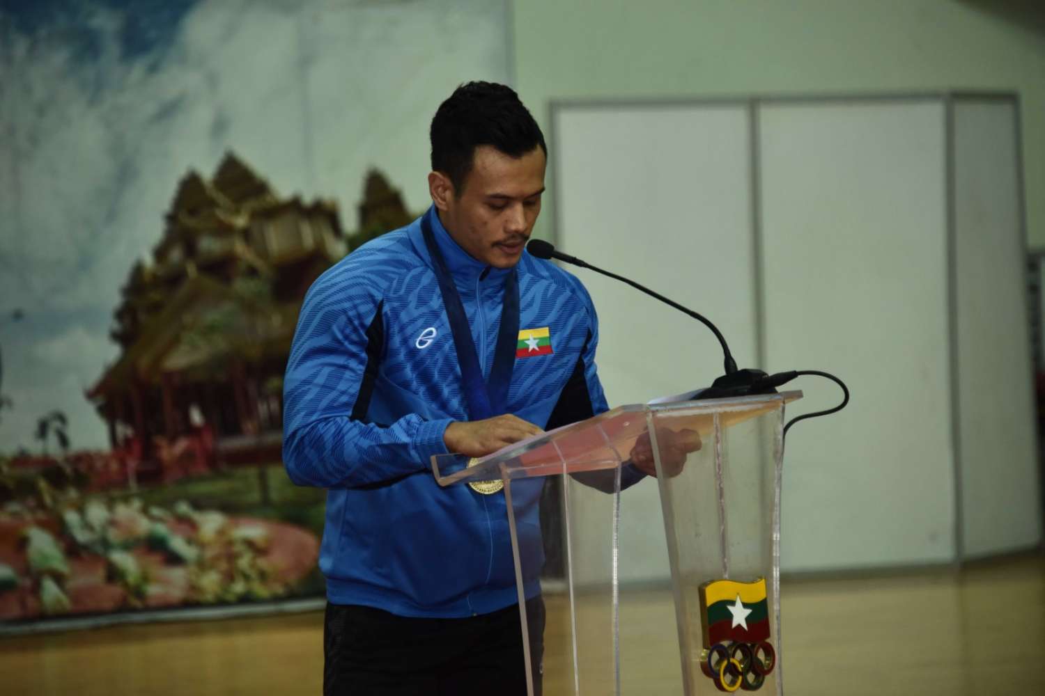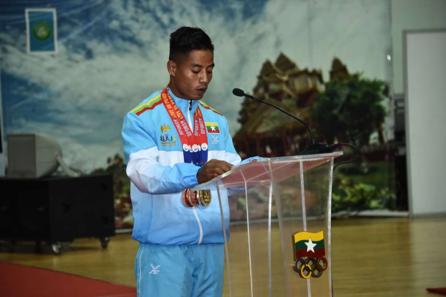 ယင်းနောက် နိုင်ငံ့ဂုဏ်ဆောင် ဆုတံဆိပ်ရအားကစားသမားများကိုယ်စား ပြေးခုန်ပစ် အားကစားနည်းမှ ရွှေတံဆိပ် ၁ ခု၊ ငွေတံဆိပ် ၁ ခုနှင့် ကြေးတံဆိပ် ၂ ခု ရရှိခဲ့သည့် အားကစားသမား တပ်ကြပ် စိုးပေနှင့် (၁၇)ကြိမ်မြောက် အရှေ့တောင် အာရှ (ဖိတ်ခေါ်) ကာယဗလနှင့် ကာယကြံ့ခိုင်မှု အားကစားပြိုင်ပွဲတွင် ရွှေတံဆိပ် ၁ ခုရရှိခဲ့သည့် မောင်ငြိမ်းချမ်းတို့က ကျေးဇူးတင်စကား ပြောကြားသည်။