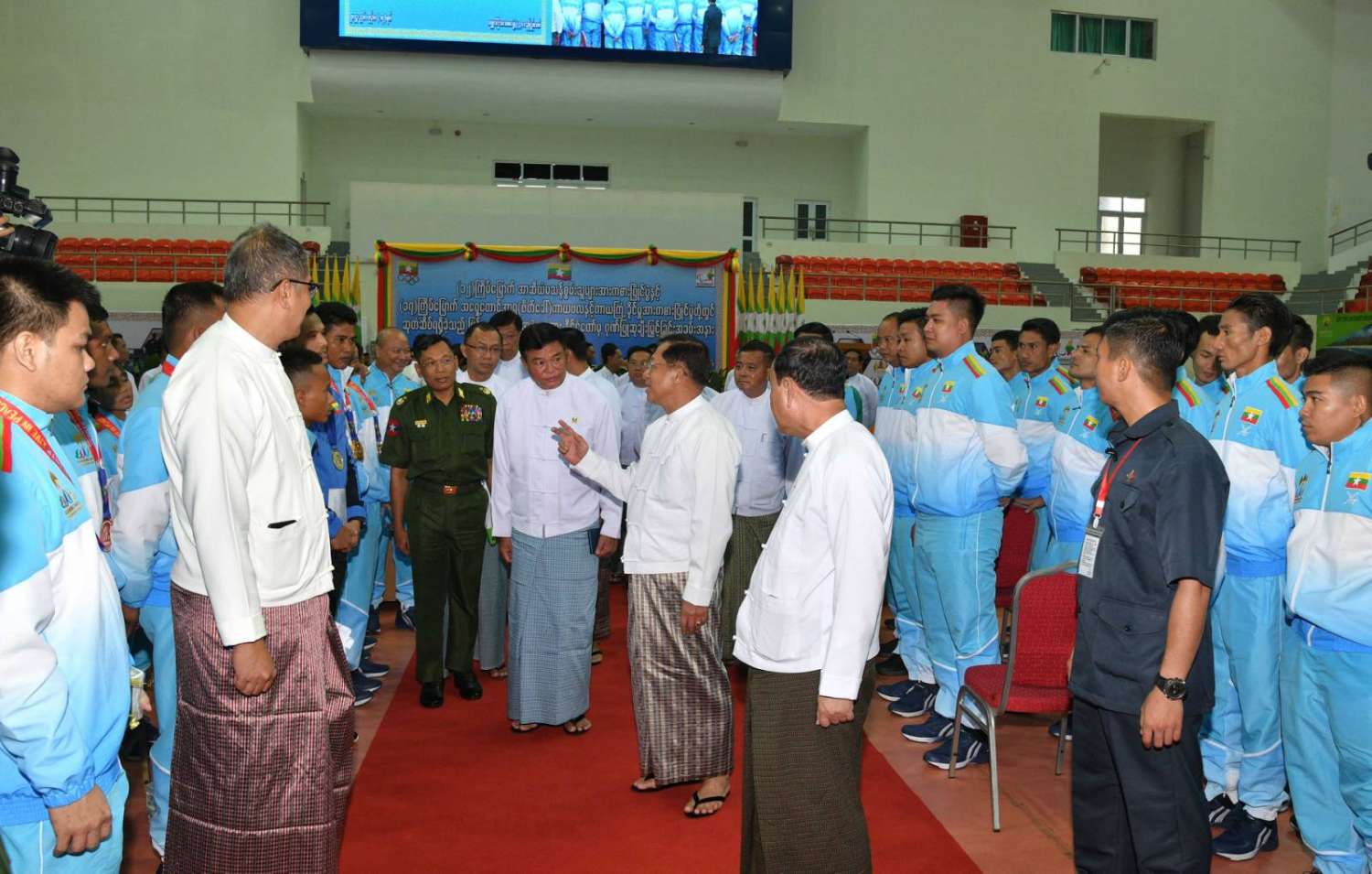 ထို့နောက် နိုင်ငံတော်စီမံအုပ်ချုပ်ရေးကောင်စီဥက္ကဋ္ဌ၊ နိုင်ငံတော်ဝန်ကြီးချုပ်နှင့် အဖွဲ့ဝင်များသည် နိုင်ငံ့ဂုဏ်ဆောင်အားကစားသမားများနှင့် နည်းပြများကို ရင်းရင်းနှီးနှီး လိုက်လံနှုတ်ဆက်သည်။