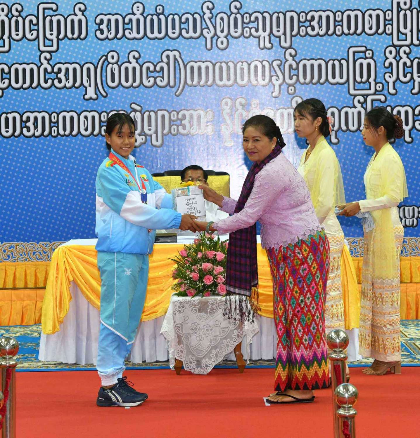 ယင်းနောက် ကောင်စီတွဲဖက်အတွင်းရေးမှူး ဒုတိယဗိုလ်ချုပ်ကြီးရဲဝင်းဦးက ပြေးခုန်ပစ် အားကစားနည်း၊ အလျားခုန်ပြိုင်ပွဲတွင် ငွေတံဆိပ် ၁ ခု၊ မီတာ ၄၀၀ ပြိုင်ပွဲ တွင် ငွေတံဆိပ် ၁ ခုနှင့် မီတာ ၂၀၀ ပြိုင်ပွဲတွင် ငွေတံဆိပ် ၁ ခုရရှိခဲ့သည့် မဝေဝေသင်း၊ အလျားခုန်ပြိုင်ပွဲတွင် ငွေတံဆိပ် ၁ ခု၊ မီတာ ၄၀၀ ပြိုင်ပွဲ တွင် ငွေတံဆိပ် ၁ ခု ရရှိခဲ့သည့် မလော်လာဝင်း၊ သံလုံးပစ်ပြိုင်ပွဲတွင် ငွေတံဆိပ် ၁ ခု၊ လှံတံပစ်ပြိုင်ပွဲတွင် ငွေတံဆိပ် ၁ ခုရရှိခဲ့သည့် မောင်စည်သူထက်၊ အလေးမ အားကစားနည်းတွင် ငွေတံ ဆိပ် ၂ ခုရရှိခဲ့သည့် မငြိမ်းစန္ဒာအောင်တို့အား ဂုဏ်ပြုဆုငွေများ ပေးအပ်ချီးမြှင့်သည်။