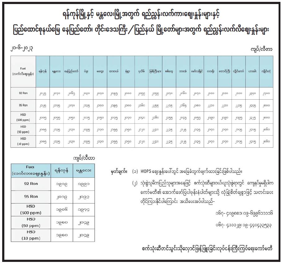 ရန်ကုန်မြို့နှင့် မန္တလေးမြို့အတွက် ရည်ညွှန်းလက်ကားဈေးနှုန်းများနှင့် ပြည်ထောင်စုနယ်မြေ နေပြည်တော်၊ တိုင်းဒေသကြီး/ပြည်နယ် မြို့တော်များအတွက် ရည်ညွှန်းလက်လီဈေးနှုန်းများ 06/20/2023