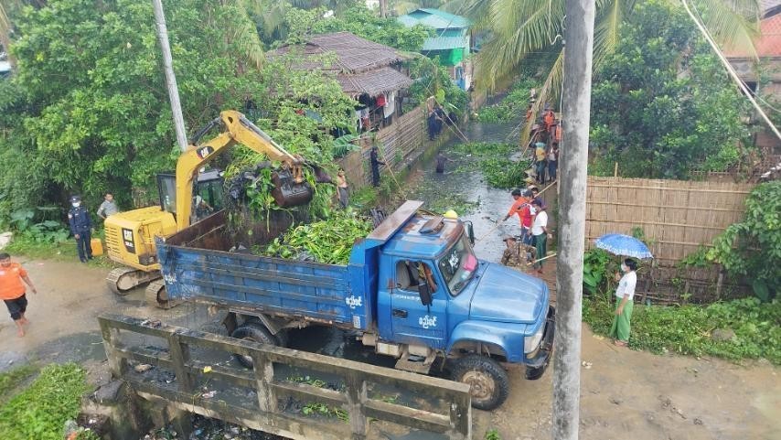 အလားတူ ရခိုင်ပြည်နယ်၊ ဘူးသီးတောင်မြို့သို့ ရောက်ရှိနေသော ဒုတိယဗိုလ်ချုပ်ကြီး အေးဝင်းနှင့် တာဝန်ရှိသူများသည် သပြေကုန်းရပ်ကွက်ရှိ မြို့လယ်ချောင်းမှ အမှိုက်များကင်းစင်ရေးနှင့် ရေစီးရေလာကောင်းမွန်စေရန်အတွက် မြန်မာနိုင်ငံရဲတပ်ဖွဲ့ဝင်များ၊ မီးသတ်တပ်ဖွဲ့ဝင်များ၊ ဌာနဆိုင်ရာတာဝန်ရှိသူများ၊ ပြည်သူလူထုများနှင့်အတူပူးပေါင်း၍ အမှိုက်များရှင်းလင်းခြင်း၊ ခြုံနွယ်ပေါင်းပင်များ ခုတ်ထွင်ရှင်းလင်းခြင်းနှင့် ရေမြောင်းများတူးဖော်ခြင်းဆောင်ရွက်နေမှုများကို သွားရောက်ကြည့်ရှုအားပေးသည်။