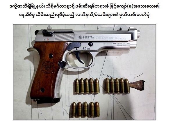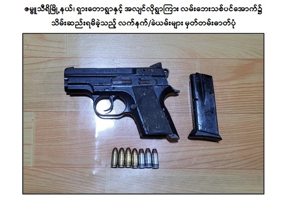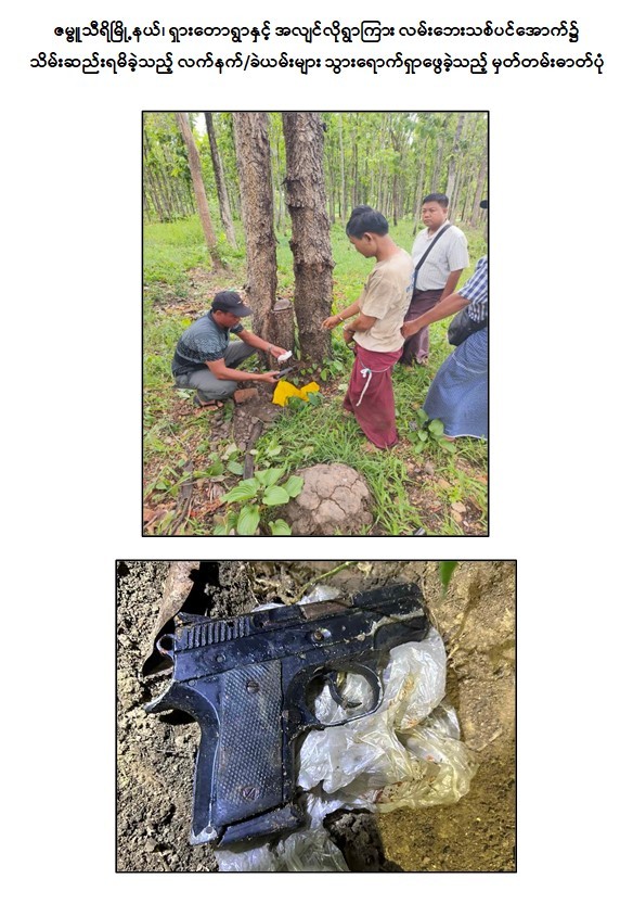 အဆိုပါအကြမ်းဖက်ဖောက်ခွဲမှုဖြစ်စဉ်များမှ တရားခံများအား စစ်ဆေးဖော်ထုတ်ချက်အရ ဇွန်လ ၂၁ ရက် နံနက်ပိုင်းတွင် ဇဗ္ဗူသီရိမြို့နယ်၊ ရှားတောကျေးရွာနှင့် အလျင်လိုကျေးရွာကြား လမ်းဘေးသစ်ပင်အောက်၌ သိုဝှက်မြှုပ်နှံထားသော CZ-2075 RAMI ပစ္စတို ၁ လက်၊ ၎င်းကျည် ၇ တောင့်တို့အားလည်းကောင်း၊ ဒက္ခိဏသီရိမြို့နယ်၊ ရွှေခဲအင်းအုပ်စု၊ သီရိမင်္ဂလာကျေးရွာရှိ မြင့်ကျော်၏ နေအိမ်မီးဖိုချောင်အတွင်း၌ သိုဝှက်ထားသော Beretta ပစ္စတို ၁ လက်၊ ၎င်းကျည် ၁၅ တောင့်တို့အားလည်းကောင်း သိမ်းဆည်းရမိခဲ့သည်။