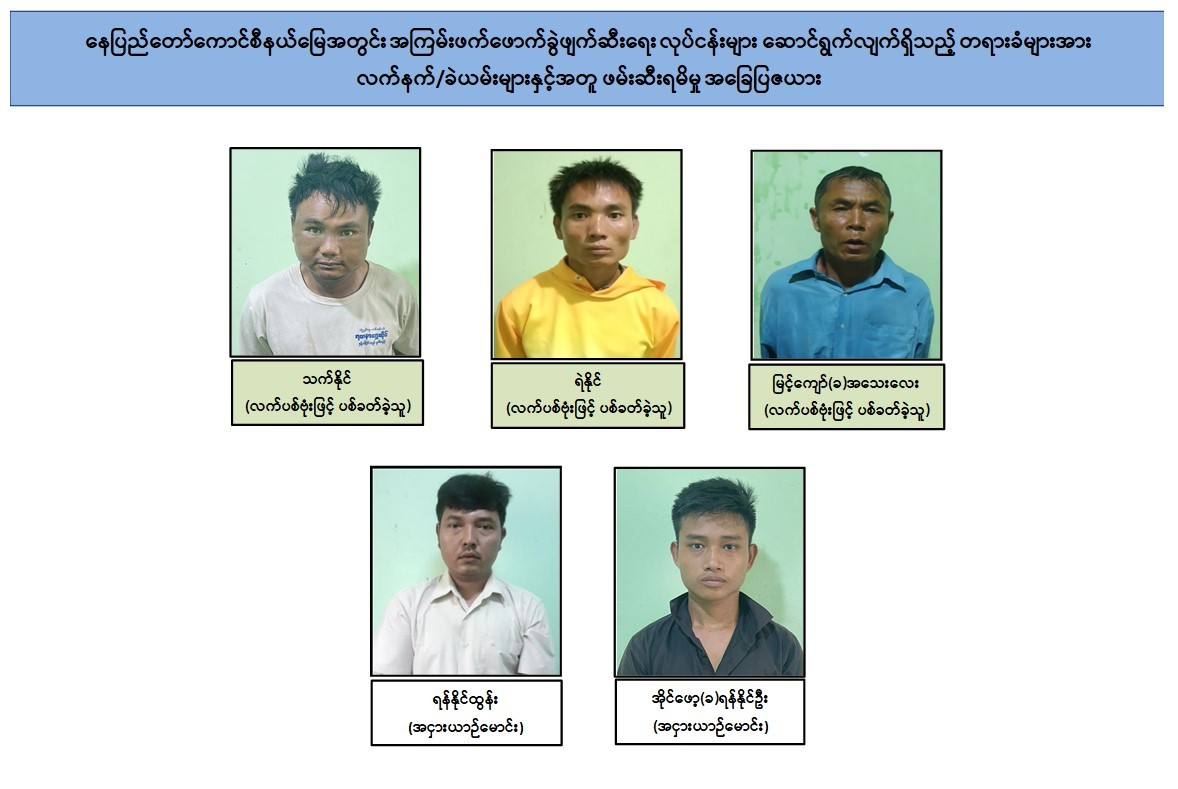 ၂၀၂၃ ခုနှစ်၊ ဇွန်လ ၁၂ ရက် ညနေပိုင်းတွင် လယ်ဝေးမြို့မရဲစခန်းအား အကြမ်းဖက်သမား ၂ ဦးမှ လက်ပစ်ဗုံးဖြင့် ချောင်းမြောင်းပစ်ခတ်ခဲ့ပြီး ယင်းနေ့ညပိုင်းတွင် နေပြည်တော်ကောင်စီနယ်မြေ၊ ဇမ္ဗူသီရိမြို့နယ်၊ ဘောဂသိဒ္ဓိရပ်ကွက်၊ MICC-II ဂိတ်(၂)ဝင်ပေါက်အား အကြမ်းဖက်သမား ၃ ဦးတို့မှ လက်ပစ်ဗုံးဖြင့် ပစ်ပေါက်ဖောက်ခွဲခဲ့သည့် ဖြစ်စဉ်များဖြစ်ပွားခဲ့ရာ လုံခြုံရေးတပ်ဖွဲ့ဝင်များ၏ အချိန်နှင့်တစ်ပြေးညီ နေ့/ညမပြတ် အရှိန်အဟုန်မြှင့်ကြိုးပမ်း ဆောင်ရွက်မှုများ၊ တရားမျှတမှုကိုလိုလားပြီး အကြမ်းဖက်မှုကိုမလိုလားသည့် ပြည်သူများ၏ မျက်မြင်သတင်းပေးပို့ချက်များနှင့် ပူးပေါင်းပါဝင်မှုများကြောင့် ပြစ်မှုကျူးလွန်သူ ၂ ဦးနှင့် ဆက်စပ်တရားခံ ကျား ၂ ဦးတို့အား ဖြစ်စဉ်ဖြစ်ပွားပြီး ၁၀ နာရီအတွင်း ဖော်ထုတ် ဖမ်းဆီးရမိခဲ့ကြောင်းအား ဇွန်လ ၁၃ ရက်တွင် သတင်းထုတ်ပြန်ခဲ့ပြီး ဖြစ်ပါသည်။