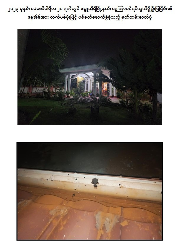 - ၂၀၂၃ ခုနှစ်၊ ဖေဖော်ဝါရီလ ၂၈ ရက်တွင် မြင့်ကျော်နှင့် သက်နိုင်တို့ ၂ ဦးသည် ဇဗ္ဗူသီရိမြို့နယ်၊ ရွှေကြာပင်ရပ်ကွက်ရှိ ဦးမြငြိမ်း၏ နေအိမ်အား လက်ပစ်ဗုံးဖြင့် ပစ်ခတ်ဖောက်ခွဲခဲ့ကြောင်း။