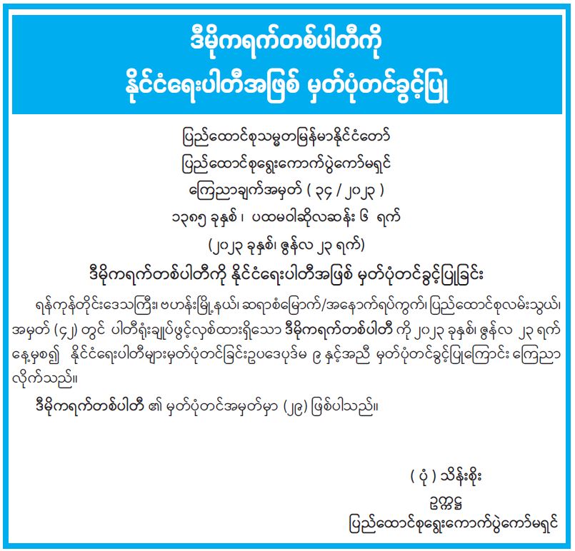 ဒီမိုကရက်တစ်ပါတီကို နိုင်ငံရေးပါတီအဖြစ် မှတ်ပုံတင်ခွင့်ပြုခြင်း 06/24/2023 ဒီမိုကရက်တစ်ပါတီကို နိုင်ငံရေးပါတီအဖြစ် မှတ်ပုံတင်ခွင့်ပြုခြင်း