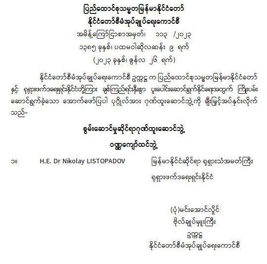 ပြည်ထောင်စုရွေးကောက်ပွဲကော်မရှင်အဖွဲ့ဝင် ဦးမျိုးလှိုင် ကာဇက်စတန်နိုင်ငံ၊ ဗဟိုရွေးကောက်ပွဲကော်မရှင် ဒုတိယဥက္ကဋ္ဌ H.E. Mr. Yerman Mukhtar အား လက်ခံတွေ့ဆုံ