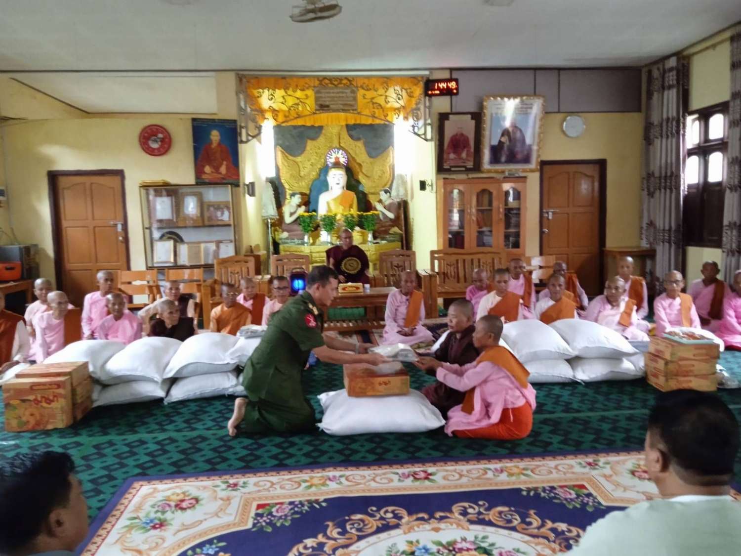 ထို့အတူ ရခိုင်ပြည်နယ် မင်းပြားမြို့သို့ရောက်ရှိနေသော ဗိုလ်မှူးချုပ်ခင်ဇော်သည့် ဌာနဆိုင်ရာ တာဝန်ရှိသူများနှင့်အတူ မင်းပြားမြို့နယ်သဘာဝဘေး အန္တရာယ်စီမံခန့်ခွဲမှုကော်မတီမှ လှူးဒါန်းသည့် ဆွမ်းဆန်တော်များနှင့် စားသောက်ဖွယ်ရာများကို သီလရှင်ကျောင်းတိုက်အသီးသီးတွင် သီတင်းသုံးဆောက်တည်နေကြသည့် သာသနာနွယ်ဝင် သီလရှင် ၃၃ ပါးအား အလယ်ပိုင်းရပ်ကွက်ရှိ ဓမ္မိကာရုံပရိယတ္တိစာသင်ကျောင်းတိုက်၌ သွားရောက် ဆက်ကပ်လှူဒါန်းသည်။