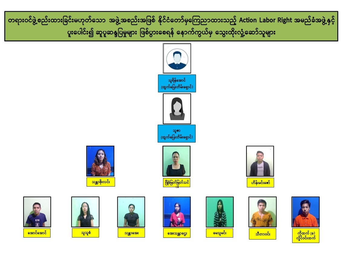 သို့ဖြစ်၍ စက်ရုံ၊ အလုပ်ရုံများ၌ ဆူပူဆန္ဒပြမှုများဖြစ်ပေါ်စေရေး နောက်ကွယ်မှသွေးထိုးလှုံ့ဆော်ခြင်း၊ ဝါဒဖြန့်ခြင်းများ ပြုလုပ်ရာတွင်ပါဝင်ခဲ့သည့် Action Labour Right အမည်ခံအဖွဲ့၊ ဟိုစိမ့်(မြန်မာ)အထည်ချုပ်စက်ရုံနှင့် Sun Apparel Myanmar အထည်ချုပ်စက်ရုံတို့မှ တရားခံ ၁၀ ဦးအား တရားဥပဒေအရ ထိရောက်စွာအရေးယူနိုင်ရေး ဆောင်ရွက်လျက်ရှိကြောင်းနှင့် ထွက်ပြေးတိမ်းရှောင်လျက်ရှိသည့် Action Labour Right အမည်ခံအဖွဲ့မှ သူရိန်အောင်၊ သူဇာနှင့် ဆက်စပ်တရားခံများ၊ နောက်ကွယ်မှ သွေးထိုးလှုံ့ဆော်ဝါဒဖြန့်သူများအား ဆက်လက်ဖော်ထုတ် အရေးယူသွားမည်ဖြစ်ကြောင်း သတင်းထုတ်ပြန် အပ်ပါသည်။