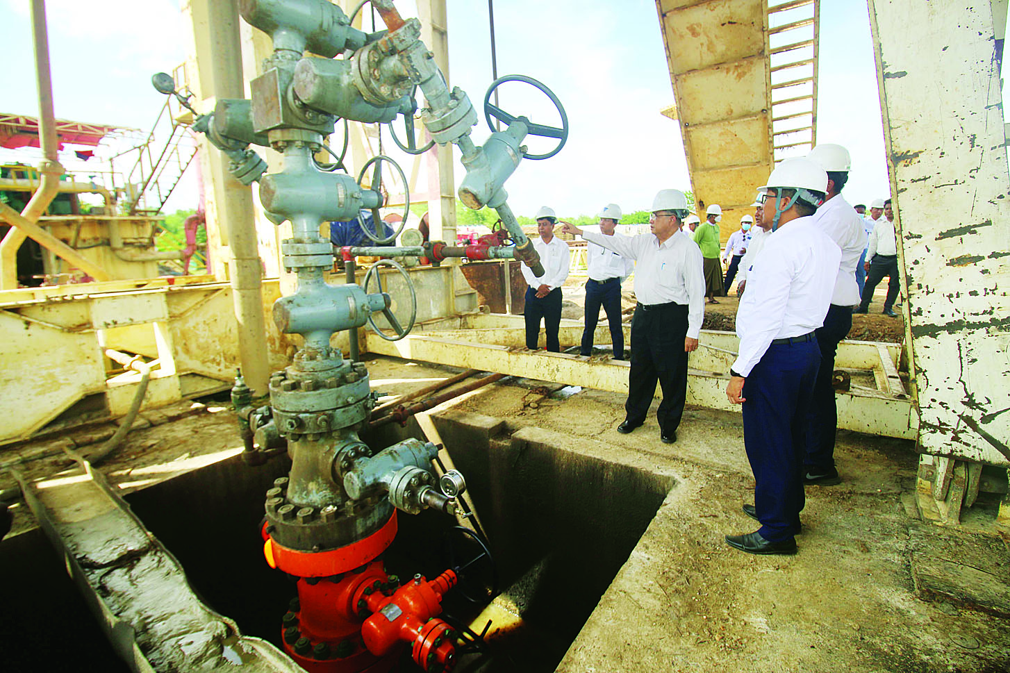 ထို့နောက် ပြည်ထောင်စုဝန်ကြီးနှင့် အဖွဲ့သည် တွင်းတူးစက်အမှတ် ZJ 50D Series 2 ဖြင့် တူးဖော်ပြီးစီးခဲ့သော တွင်းအမှတ် NW-3-1 ၏ စမ်းသပ်နေမှု အခြေအနေများကို ကြည့်ရှုစစ်ဆေးရာ မြန်မာ့ရေနံနှင့်သဘာဝဓာတ်ငွေ့လုပ်ငန်းမှ တာဝန်ရှိသူများက စမ်းသပ်ဆောင်ရွက်နေမှု အခြေအနေများကို ရှင်းလင်းတင်ပြကြပြီး ပြည်ထောင်စုဝန်ကြီးက လိုအပ်သည်များကို မှာကြား၍ ဝန်ထမ်းများကို အမှတ်တရ သစ်သီးခြင်းနှင့် အင်အားဖြည့်အစား အစာများပေးအပ်သည်။