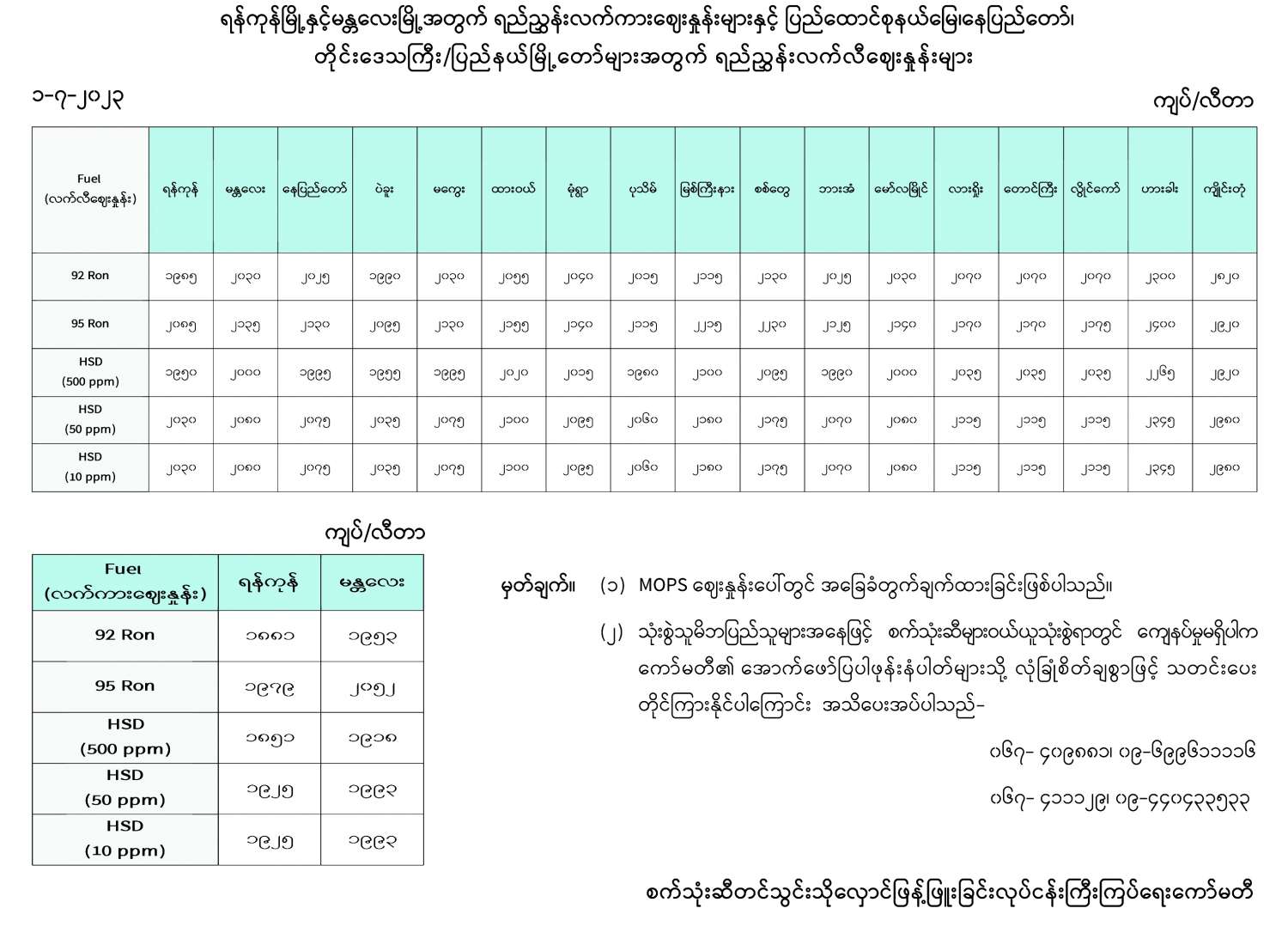 ရန်ကုန်မြို့နှင့် မန္တလေးမြို့အတွက် ရည်ညွှန်းလက်ကားဈေးနှုန်းများနှင့် ပြည်ထောင်စုနယ်မြေ နေပြည်တော်၊ တိုင်းဒေသကြီး/ပြည်နယ် မြို့တော်များအတွက် ရည်ညွှန်းလက်လီဈေးနှုန်းများ 07/01/2023