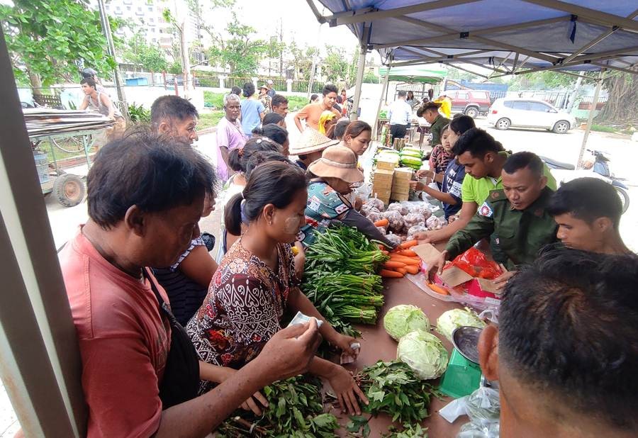 ဆိုင်ကလုန်းမုန်တိုင်း (မိုခါ) တိုက်ခတ်မှုကြောင့် ပျက်စီးမှုများဖြစ်ပေါ်ခဲ့သည့် စစ်တွေမြို့နှင့်ရသေ့တောင်မြို့တို့ရှိ မုန်တိုင်းဒဏ်သင့်ဒေသခံပြည်သူများနှင့် ဌာနဆိုင်ရာဝန်ထမ်းများ၏ စားသောက်ရေးအဆင်ပြေစေရန်နှင့် မိမိတို့အလိုရှိရာစားသောက်ကုန်ပစ္စည်းများကို ဈေးနှုန်းသက်သာစွာဖြင့် ဝယ်ယူစားသောက်နိုင်ရေးအတွက် အနောက်ပိုင်းတိုင်းစစ်ဌာနချုပ်၊ နယ်မြေခံတပ်မတော်သားများနှင့် တာဝန်ရှိသူများက နေ့စဉ်ရောင်းချပေးလျက်ရှိသည်။