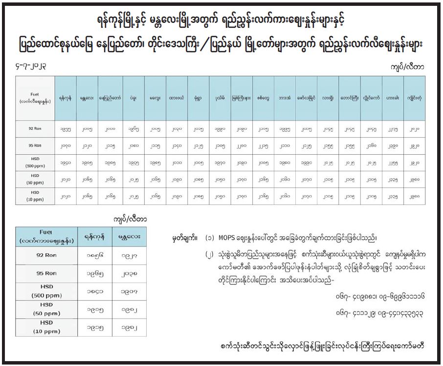 ရန်ကုန်မြို့နှင့် မန္တလေးမြို့အတွက် ရည်ညွှန်းလက်ကားဈေးနှုန်းများနှင့် ပြည်ထောင်စုနယ်မြေ နေပြည်တော်၊ တိုင်းဒေသကြီး/ပြည်နယ် မြို့တော်များအတွက် ရည်ညွှန်းလက်လီဈေးနှုန်းများ 07/04/2023