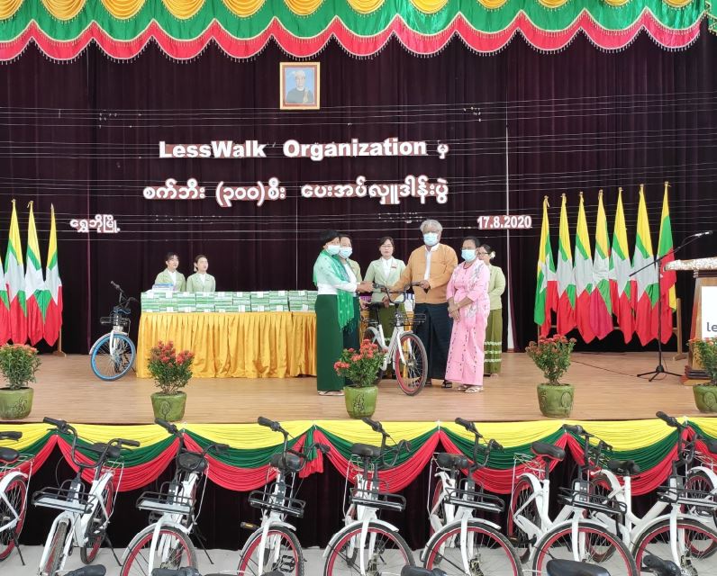 ရှေးဦးစွာ စစ်ကိုင်းတိုင်းဒေသကြီးဝန်ကြီးချုပ် ဒေါက်တာမြင့်နိုင်က ဆင်းရဲနွမ်းပါးပြီး ကျောင်းသွားရန်သွားလာရေး ခက်ခဲသော ကျောင်းသား/သူများကိုအဆင်ပြေချောမွေ့စွာပညာသင်ကြားနိုင်ရန် လှူဒါန်းရခြင်းဖြစ်ကြောင်းနှင့် ပညာရေးကဏ္ဍ ဖွံ့ဖြိုး တိုးတက်ရေးကိုလည်း အလေးထားဆောင်ရွက်နေကြောင်းပြောကြားခဲ့ပြီး Less Walk Organization ၏နာယက ထာဝရမန္တလေး ဖောင်ဒေးရှင်းဥက္ကဋ္ဌ ဦးမောင်ကိုက စက်ဘီး (၃၀၀) လှူဒါန်း ရခြင်းအပေါ် ဝမ်းသာပီတိစကား ပြောကြားခဲ့သည်။ ထို့နောက် Less Walk Organization တည်ထောင်သူ ကိုမိုက်သန်းထွန်းဝင်းက စက်ဘီးအစီး(၃၀၀) လှူဒါန်းရခြင်းနှင့် ပတ်သက်၍ ရှင်းလင်းပြော ကြားခဲ့သည်။