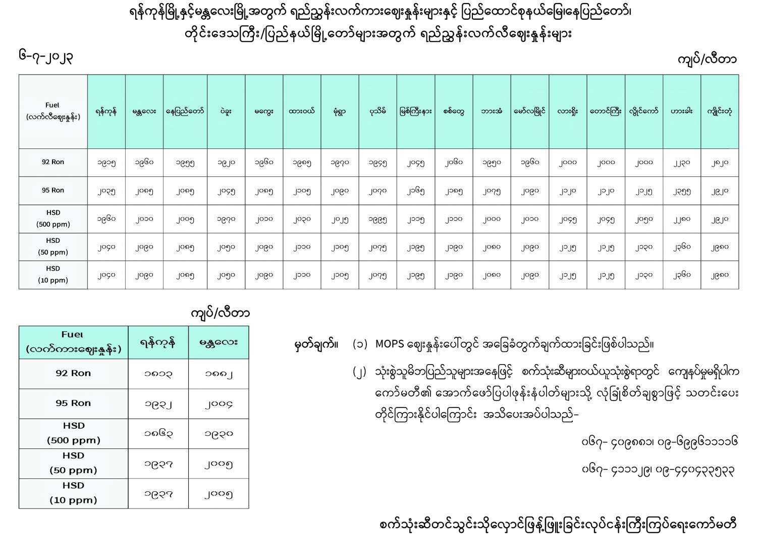 ရန်ကုန်မြို့နှင့် မန္တလေးမြို့အတွက် ရည်ညွှန်းလက်ကားဈေးနှုန်းများနှင့် ပြည်ထောင်စုနယ်မြေ နေပြည်တော်၊ တိုင်းဒေသကြီး/ပြည်နယ်မြို့တော်များအတွက် ရည်ညွှန်းလက်လီဈေးနှုန်းများ 07/06/2023