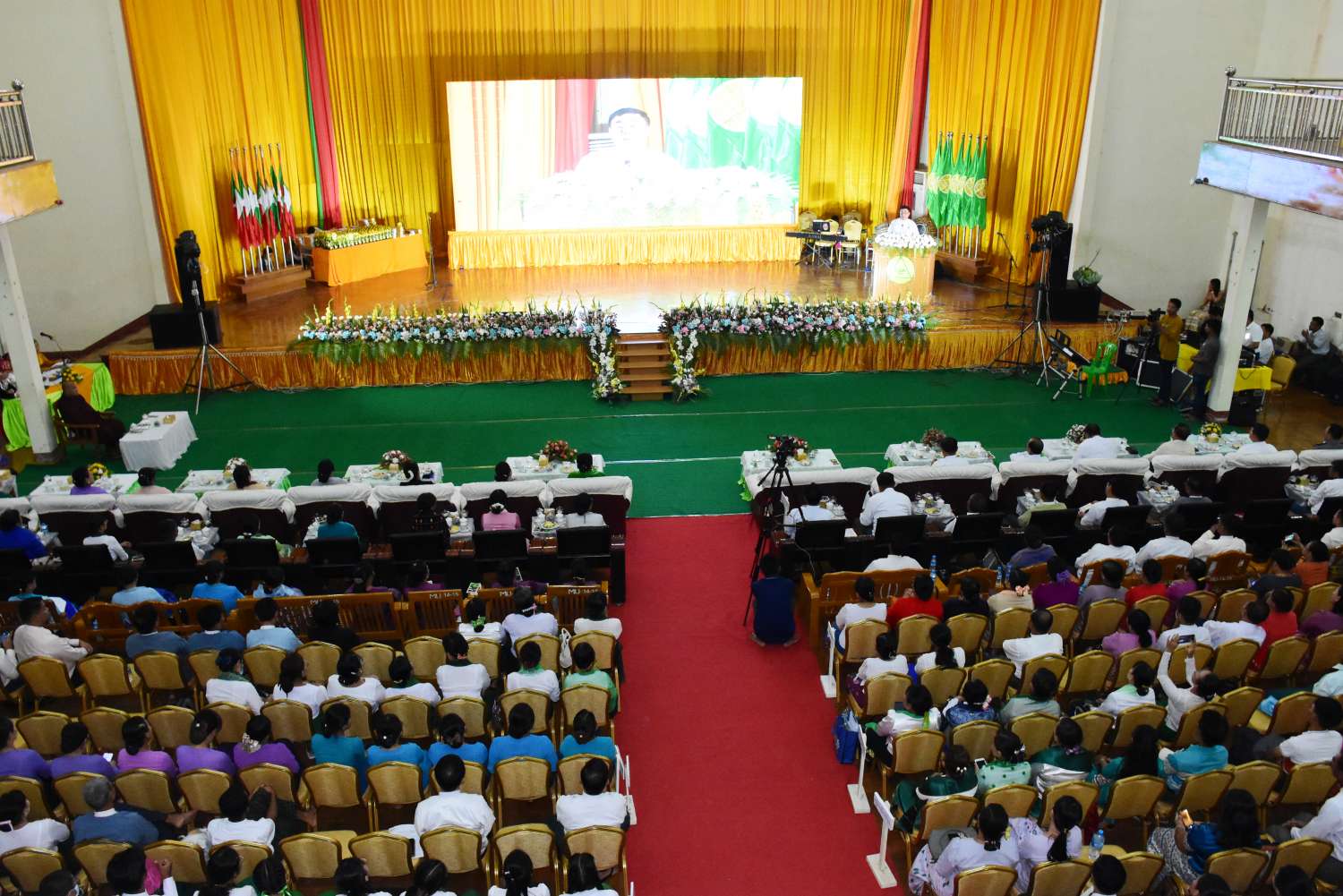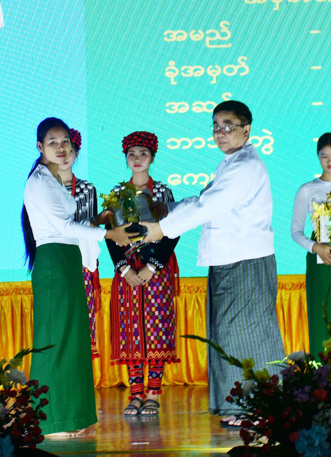 ထို့နောက် ပြည်ထောင်စုဝန်ကြီး၊ ကချင်ပြည်နယ်ဝန်ကြီးချုပ်နှင့်ဇနီး၊ ကချင်ပြည်နယ် တရားလွှတ်တော်တရားသူကြီးချုပ်၊ မြောက်ပိုင်းတိုင်းစစ်ဌာနချုပ် ဒုတိယတိုင်းမှူးနှင့် ကချင်ပြည်နယ်အစိုးရအဖွဲ့ဝန်ကြီးများ၊ ပြည်နယ်ဥပဒေချုပ်၊ မြစ်ကြီးနား တက္ကသိုလ်ပါမောက္ခချုပ်နှင့် တာဝန်ရှိသူများက ထူးချွန် ကျောင်းသား ကျောင်းသူများနှင့် ဂုဏ်ထူး အများဆုံး ရအောင်သင်ကြားပေးသည့် ဆရာဆရာမ (၃)ဦးနှင့်ကိုယ်ပိုင်ကျောင်းများကို ဂုဏ်ပြုဆုများ ချီးမြှင့်သည်။