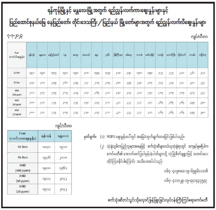ရန်ကုန်မြို့နှင့် မန္တလေးမြို့အတွက် ရည်ညွှန်းလက်ကားဈေးနှုန်းများနှင့် ပြည်ထောင်စုနယ်မြေ နေပြည်တော်၊ တိုင်းဒေသကြီး/ပြည်နယ် မြို့တော်များအတွက် ရည်ညွှန်းလက်လီဈေးနှုန်းများ 07/07/2023