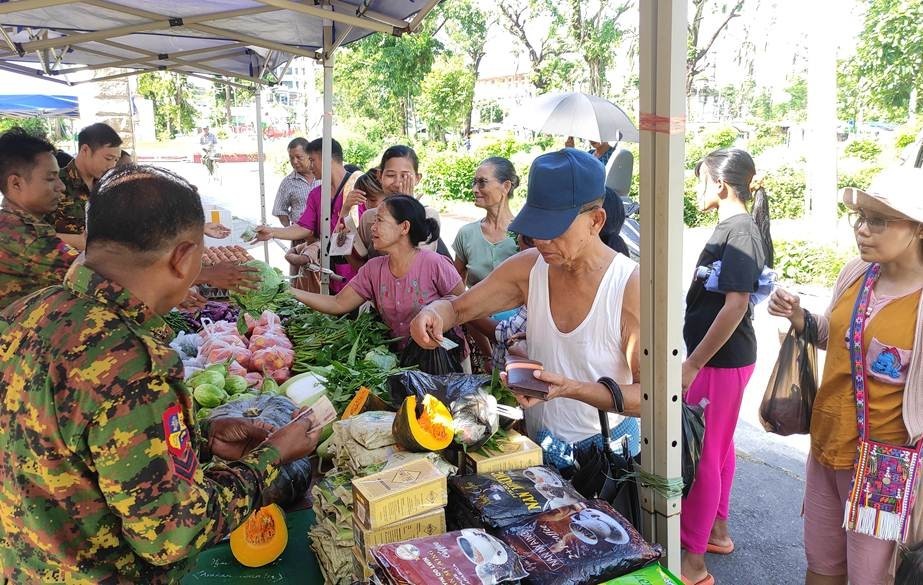 ဆိုင်ကလုန်းမုန်တိုင်း(မိုခါ)တိုက်ခတ်မှုကြောင့် ပျက်စီးမှုများဖြစ်ပေါ်ခဲ့သည့် စစ်တွေမြို့ရှိ မုန်တိုင်းဒဏ်သင့် ဒေသခံပြည်သူများနှင့် ဌာနဆိုင်ရာဝန်ထမ်းများ၏ စားသောက်ရေးအဆင်ပြေစေရန်နှင့် မိမိတို့အလိုရှိရာ စားသောက်ကုန်ပစ္စည်းများကို ဈေးနှုန်းသက်သာစွာဖြင့် ဝယ်ယူစားသောက်နိုင်ရေးအတွက် အနောက်ပိုင်းတိုင်းစစ်ဌာနချုပ်၊ နယ်မြေခံတပ်မတော်သားများနှင့် တာဝန်ရှိသူများက နေ့စဉ်ရောင်းချပေး လျက်ရှိသည်။