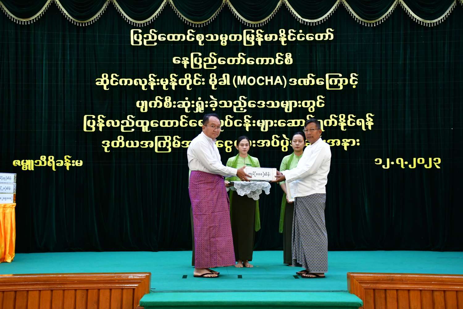 မိုခါဆိုင်ကလုန်းမုန်တိုင်းဒဏ်ကြောင့် ပျက်စီးဆုံးရှုံးခဲ့သည့်ဒေသများ၌ ပြန်လည်ထူထောင်ရေးလုပ်ငန်းများ ဆောင်ရွက်နိုင်ရန် ဌာနဆိုင်ရာများ၊ အလှူရှင်များကလှူဒါန်းသည့် ဒုတိယအကြိမ် အလှူငွေပေးအပ်လှူဒါန်းခြင်းအခမ်းအနားကို ယနေ့နံနက် ၁၀ နာရီတွင် နေပြည်တော်ကောင်စီရုံးဝန်းရှိ ဇမ္ဗူသီရိခန်းမ၌ကျင်းပသည်။