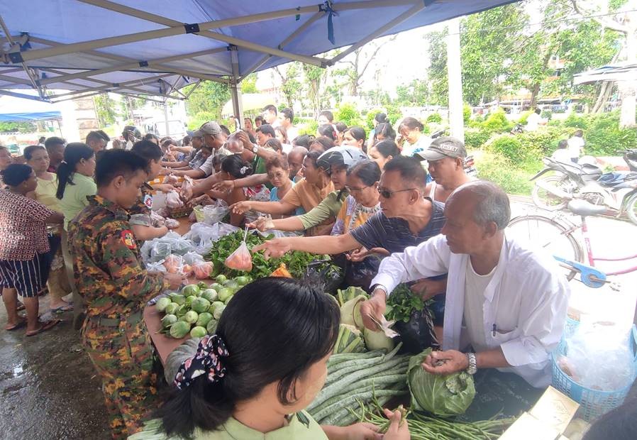 ဆိုင်ကလုန်းမုန်တိုင်း (မိုခါ) တိုက်ခတ်မှုကြောင့် ပျက်စီးမှုများဖြစ်ပေါ်ခဲ့သည့် စစ်တွေမြို့ရှိ မုန်တိုင်းဒဏ်သင့် ဒေသခံပြည်သူများနှင့် ဌာနဆိုင်ရာဝန်ထမ်းများ၏ စားသောက်ရေးအဆင်ပြေစေရန်နှင့် မိမိတို့အလိုရှိရာ စားသောက်ကုန်ပစ္စည်းများကို ဈေးနှုန်းသက်သာစွာဖြင့် ဝယ်ယူစားသောက်နိုင်ရေးအတွက် အနောက်ပိုင်းတိုင်း စစ်ဌာနချုပ်၊ နယ်မြေခံတပ်မတော်သားများနှင့် တာဝန်ရှိသူများက နေ့စဉ်ရောင်းချပေးလျက်ရှိသည်။