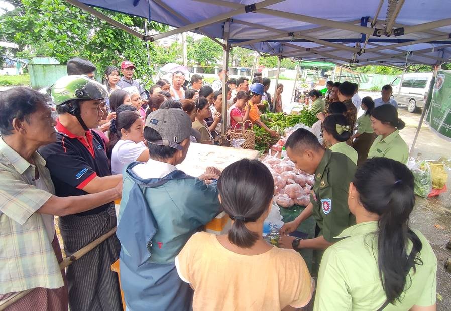 ယနေ့တွင်လည်း စစ်တွေမြို့၊ ဦးဥတ္တမပန်းခြံနှင့် ဘူးသီးတောင်မြို့၊ ဦးဥတ္တမ ခန်းမရှေ့၌ ဆန်၊ ဆီ၊ ဆား၊ အသား/ ငါး ကြက်ဥ၊ ဘဲဥ၊ နို့ထွက်ပစ္စည်းများ၊ ဟင်းသီးဟင်းရွက်များ၊ ကြက်သွန်နီ၊ ကြက်သွန်ဖြူနှင့် တပ်မတော်စက်ရုံများနှင့် မြန်မာစီးပွားရေးကော်ပိုရေးရှင်းတို့မှ ထုတ်လုပ်သည့် ခေါက်ဆွဲခြောက်၊ ဘီစကွတ်နှင့် စည်သွပ်ဘူးများဖြစ်သည့် အမဲသားဘူး၊ မျှစ်စားတော်ပဲဘူး၊ ကြက်သား အာလူးဘူး၊ ငါးတန်အချိုပေါင်းဘူး၊ ငါးသလောက်ဘူး၊ ငပိကြော်ဘူး၊ ပဲထောပတ်ဘူး၊ ပဲခရမ်းဘူး၊ သရက်သီးသနပ်ဘူး စသည့် စားသောက်ကုန်များ၊ မြန်မာ့စီးပွားရေးဦးပိုင်အများနှင့် သက်ဆိုင်သော ကုမ္ပဏီလီမိတက် အရောင်းဆိုင်များ၏ စားကုန်ပစ္စည်းများ၊ လျှပ်စစ်ပစ္စည်းများနှင့် အိမ်ဆောက်ပစ္စည်းများကို ပြင်ပပေါက်ဈေးထက် သက်သာသော ဈေးနှုန်းများဖြင့် ဆက်လက်ရောင်းချပေးလျက်ရှိသည်။