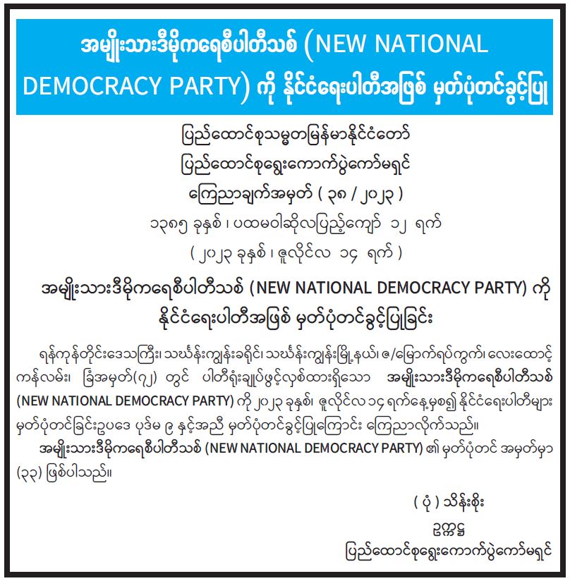 အမျိုးသားဒီမိုကရေစီပါတီသစ် (NEW NATIONAL DEMOCRACY PARTY) ကို နိုင်ငံရေးပါတီအဖြစ် မှတ်ပုံတင်ခွင့်ပြု 07/15/2023 အမျိုးသားဒီမိုကရေစီပါတီသစ် (NEW NATIONAL DEMOCRACY PARTY) ကို နိုင်ငံရေးပါတီအဖြစ် မှတ်ပုံတင်ခွင့်ပြု