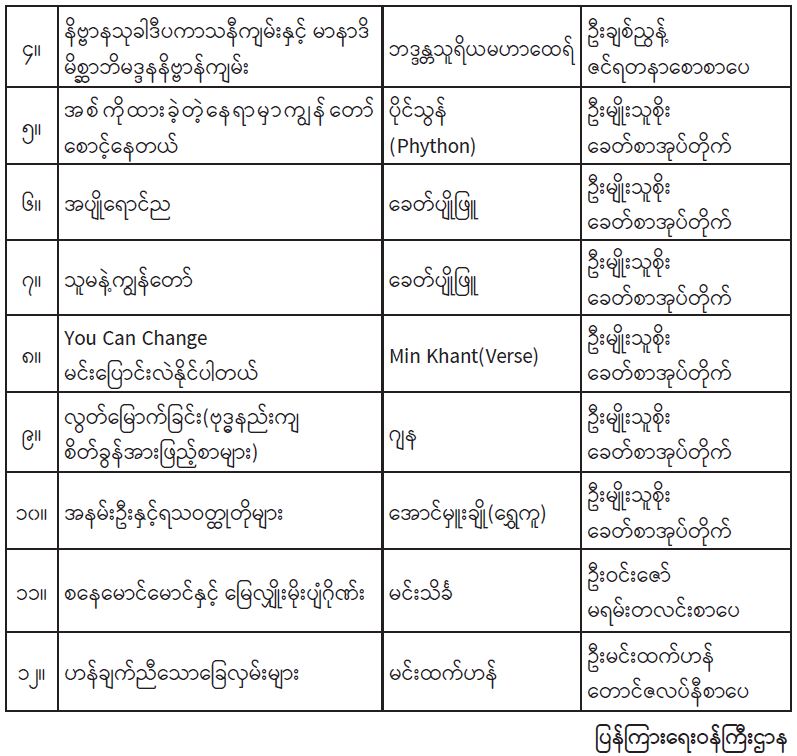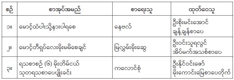 ပုံနှိပ်ခြင်းနှင့်ထုတ်ဝေခြင်းလုပ်ငန်းဥပဒေအရ ထုတ်ဝေသူသည် မိမိထုတ်ဝေသာ ထုတ်ဝေစာ ၅ အုပ် သို့မဟုတ် ၅ စောင်ကို ဖြန့်ချိသည့်နေ့မှစ၍ ၁၄ ရက်အတွင်း ပုံစံ (၁၁)ဖြင့် ပြန်ကြားရေးဝန်ကြီးဌာန၊ ပြန်ကြားရေးနှင့်ပြည်သူ့ဆက်ဆံရေးဦးစီးဌာန၊ မူပိုင်ခွင့်နှင့်မှတ်ပုံတင်ဌာနခွဲသို့ ပေးပို့အပ်နှံရမည်ဖြစ်ပါသည်။ ယခုအခါ အောက်ဖော်ပြပါထုတ်ဝေသူများသည် ပုံနှိပ်ခြင်းနှင့်ထုတ်ဝေခြင်းလုပ်ငန်းဥပဒေနှင့် အညီမူပိုင်ခွင့်နှင့်မှတ်ပုံတင်ဌာနခွဲသို့ ပေးပို့အပ်နှံရန် ပျက်ကွက်လျက်ရှိပါသဖြင့် အမြန်ဆုံးပေးအပ်နိုင်ပါရန် အသိပေးကြေညာအပ်ပါသည်-