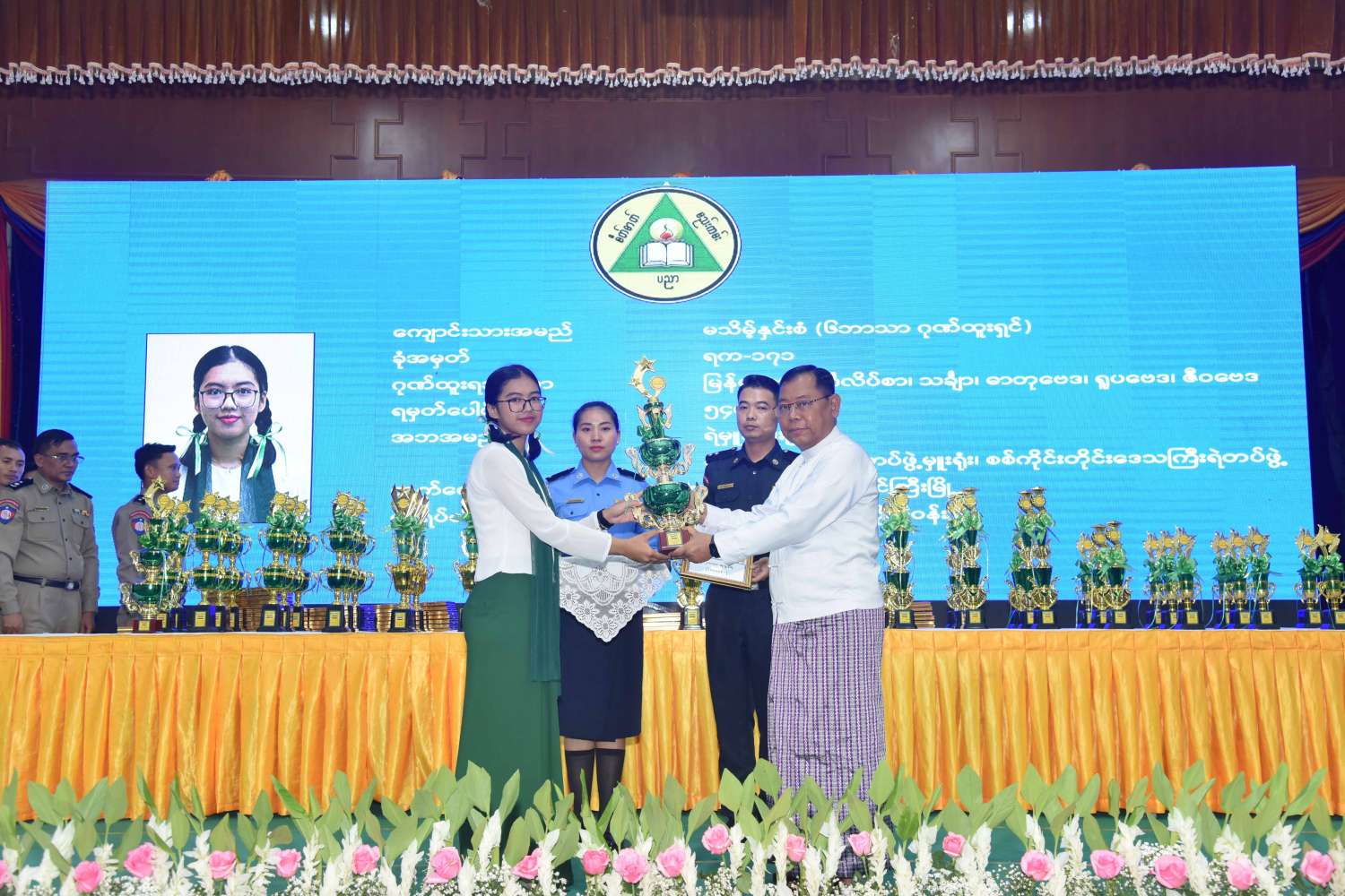 ဆက်လက်၍ ပြည်ထောင်စုဝန်ကြီး က ခြောက်ဘာသာဂုဏ်ထူးရှင် (၄)ဦးနှင့် ငါးဘာသာဂုဏ်ထူးရှင် (၄)ဦးတို့ကို လည်းကောင်း၊ ဒုတိယဝန်ကြီး ဗိုလ်ချုပ် တိုးရီက ငါးဘာသာဂုဏ်ထူးရှင်(၇)ဦး၊ လေးဘာသာဂုဏ်ထူးရှင်(၁)ဦးတို့ကို လည်းကောင်း၊ ဒုတိယ ဝန်ကြီး၊ မြန်မာနိုင်ငံရဲတပ်ဖွဲ့ ရဲချုပ် ဗိုလ်ချုပ် ဇင်မင်းထက်က လေးဘာသာဂုဏ်ထူးရှင် (၈)ဦးကို လည်းကောင်း၊ အမြဲတမ်းအတွင်းဝန်နှင့် ဌာနဆိုင်ရာအကြီးအကဲများက လေးဘာသာဂုဏ်ထူးရှင်(၄)ဦး၊ သုံးဘာသာ ဂုဏ်ထူးရှင်(၁၆)ဦး၊ နှစ်ဘာသာဂုဏ်ထူးရှင် (၃)ဦး၊ တစ်ဘာသာ ဂုဏ်ထူးရှင်(၁၁)ဦးတို့ကို လည်းကောင်း ပညာထူးချွန်ဆုများပေးအပ်ပြီး ဂုဏ်ထူးရ ကျောင်းသား/ ကျောင်းသူများကိုယ်စား မြန်မာနိုင်ငံရဲတပ်ဖွဲ့မှ ခြောက်ဘာသာ ဂုဏ်ထူးရှင် ကျောင်းသူ မသိမ့်နှင်းစံ က ကျေးဇူးတင်စကား ပြန်လည်ပြောကြားသည်။