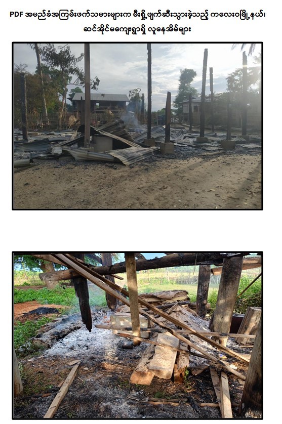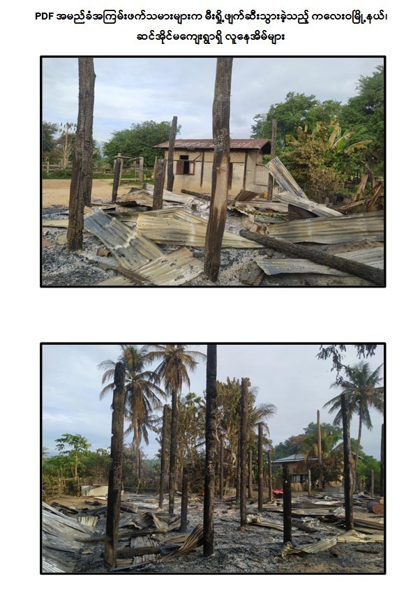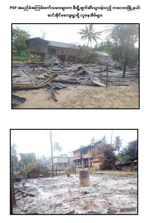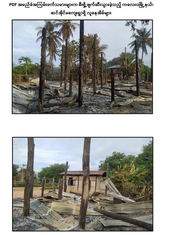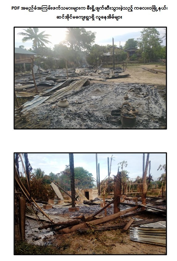 PDF အမည်ခံအကြမ်းဖက်သမားများအနေဖြင့် အကြမ်းဖက်လုပ်ရပ်များ ဆောင်ရွက်၍ လုံခြုံရေး တပ်ဖွဲ့ဝင်များနှင့် ထိတွေ့တိုက်ပွဲဖြစ်ချိန်တွင် ဒေသခံကျေးရွာသူ၊ ကျေးရွာသားများအား လူသားတံတိုင်းသဖွယ် အကာအကွယ်ရယူခြင်း၊ ကျေးရွာများအနီး တိုက်ပွဲဖြစ်ပွားပြီး ၎င်းတို့ အထိနာ၍ ဆုတ်ခွာထွက်ပြေးချိန်တွင်လည်း လုံခြုံရေးတပ်ဖွဲ့ဝင်များက ၎င်းတို့၏ နောက်သို့ ထပ်ကြပ် လိုက်လံချေမှုန်းခြင်း မပြုနိုင်ရန် ကျေးရွာများအား မီးရှို့ဖျက်ဆီးခြင်းများ လုပ်ဆောင်လျက်ရှိသည်။