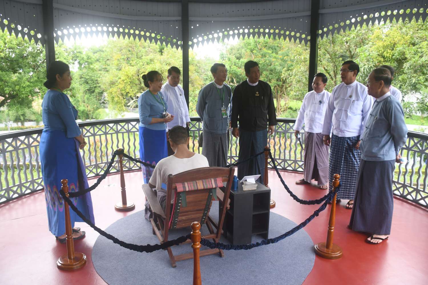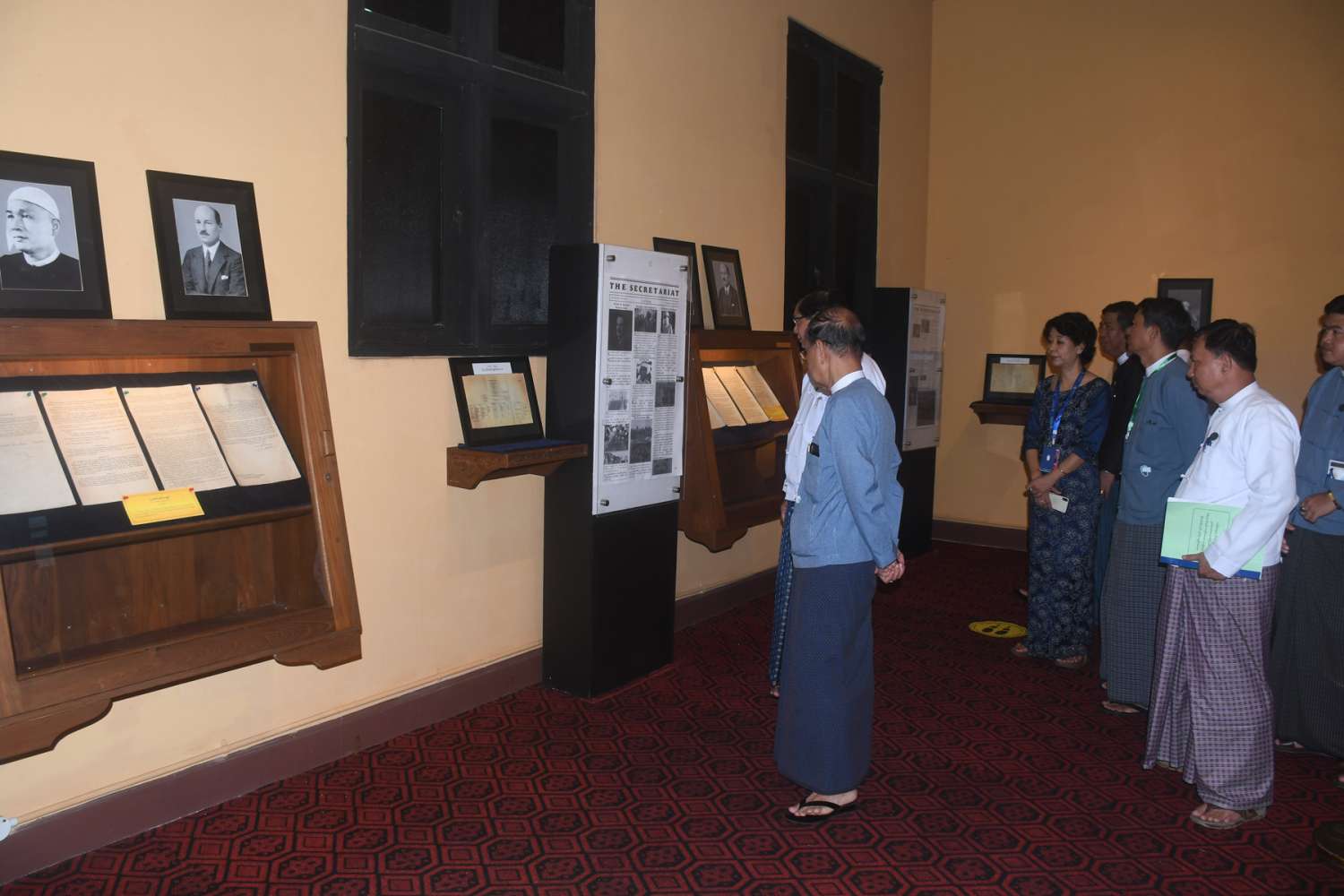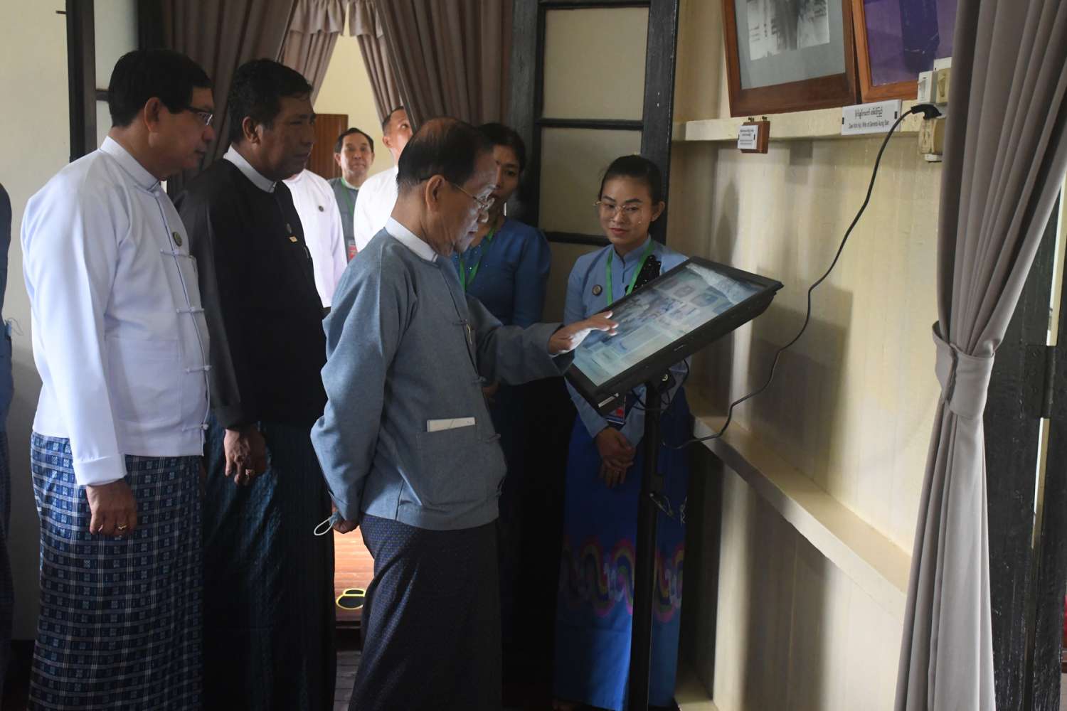 ဆက်လက်၍ ပြည်ထောင်စုဝန်ကြီးနှင့်အဖွဲ့သည် ဗိုလ်တထောင်မြို့နယ်၊ အတွင်းဝန်ရုံး (ယခင်ဝန်ကြီးများရုံး) ၏ ပြတိုက်အတွင်း လှည့်လည်ကြည့်ရှု စစ်ဆေးသည်။
