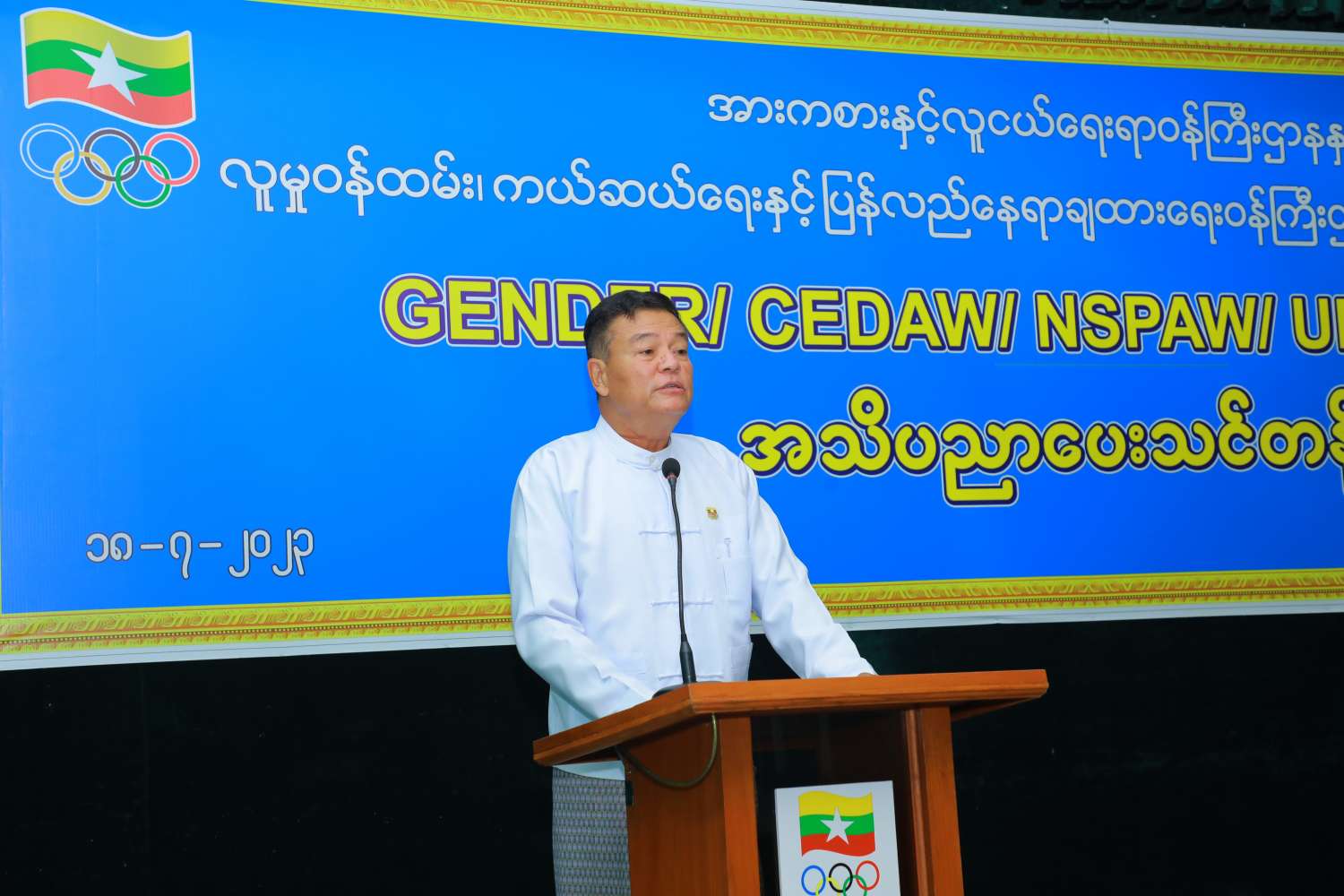 အားကစားနှင့်လူငယ်ရေးရာဝန်ကြီးဌာနနှင့် လူမှုဝန်ထမ်း၊ ကယ်ဆယ်ရေးနှင့် ပြန်လည်နေရာချထားရေးဝန်ကြီးဌာနတို့ ပူးပေါင်းဖွင့်လှစ်သည့် GENDER/ CEDAW/ NSPAW/ UNSCR 1325 အသိပညာပေး သင်တန်းဖွင့်ပွဲ အခမ်းအနားကို ယနေ့နံနက်(၉)နာရီတွင် နေပြည်တော် အားကစား လေ့ကျင့်ရေးစခန်း (Gold Camp)ရှိ Multipurpose Hall ၌ ကျင်းပသည်။